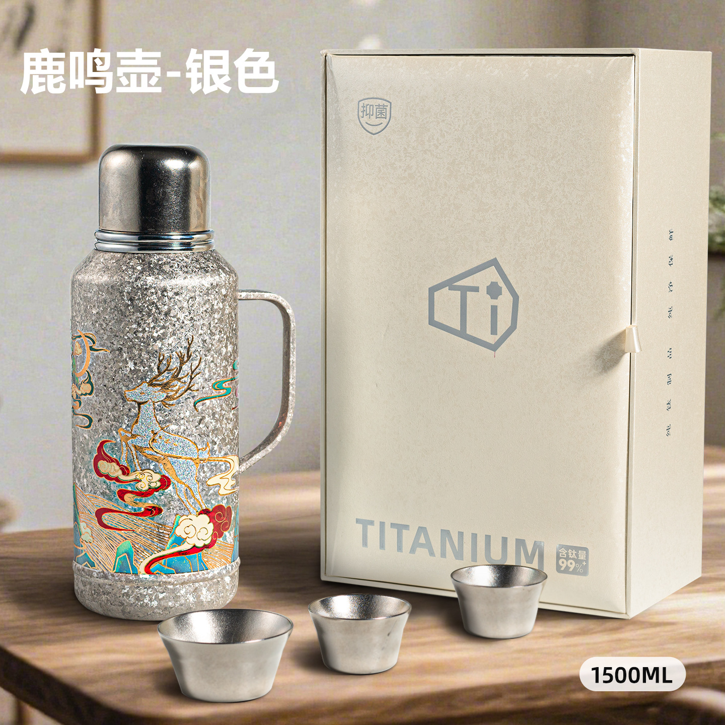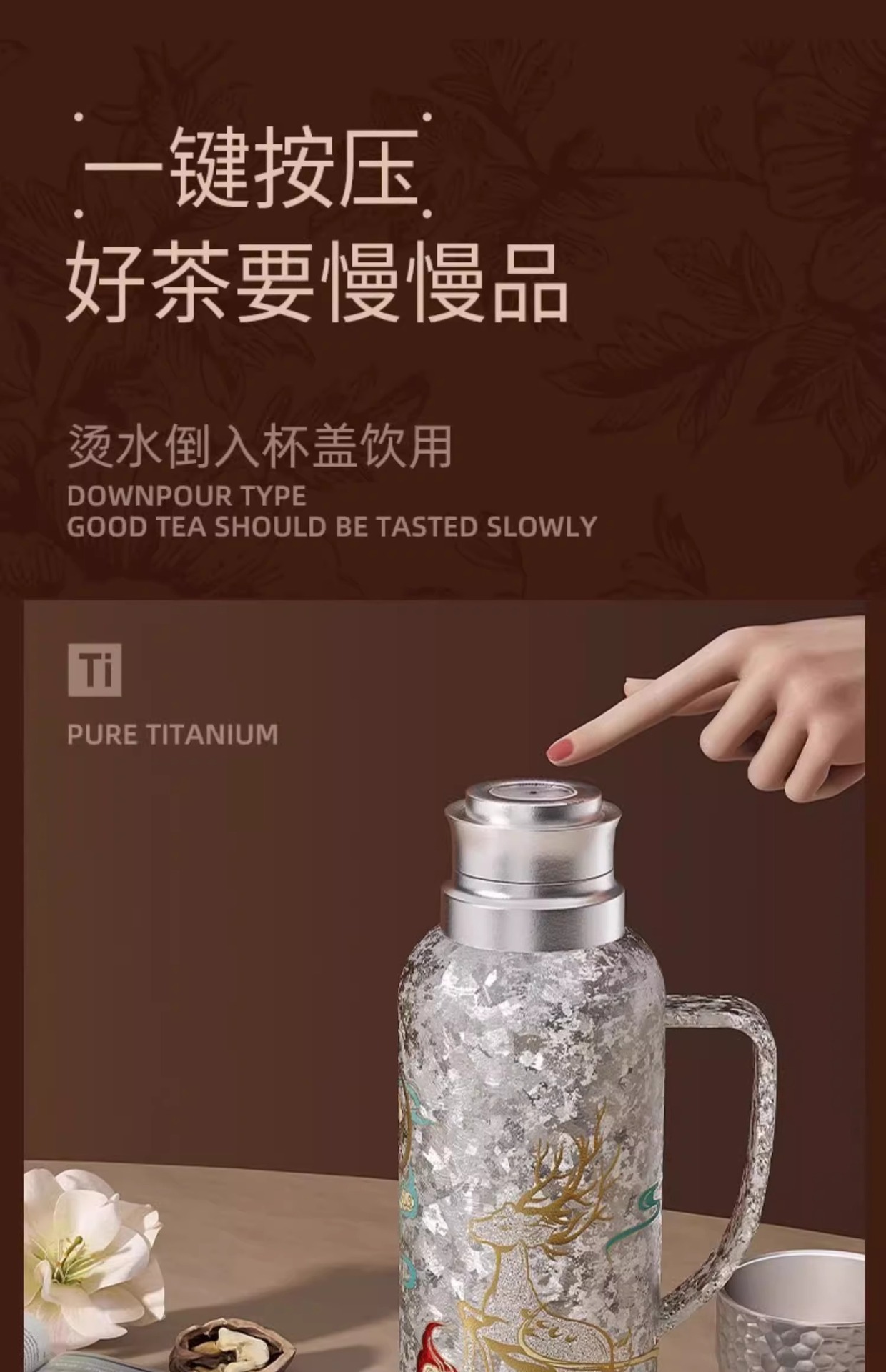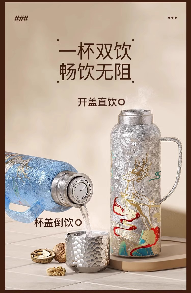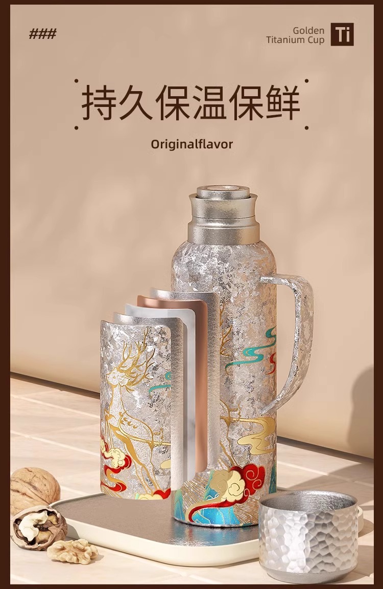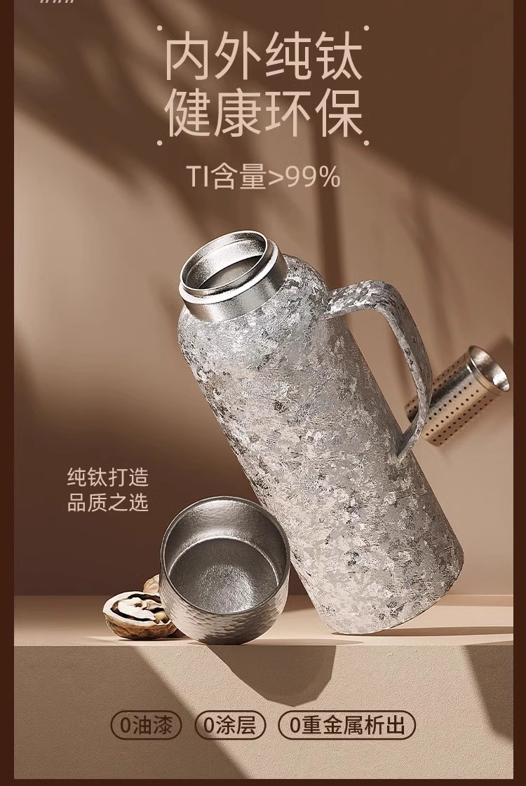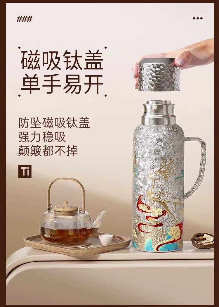 900ML传家壶内外纯钛保温壶带手柄磁吸盖钛杯大容量水壶