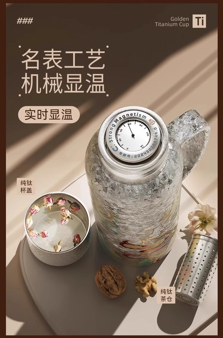 純チタン製保温カップ、内外が純チタン、ビジネス・オフィス用茶保温カップ、機械式温度表示、車載保温ポット、学生用保温カップ