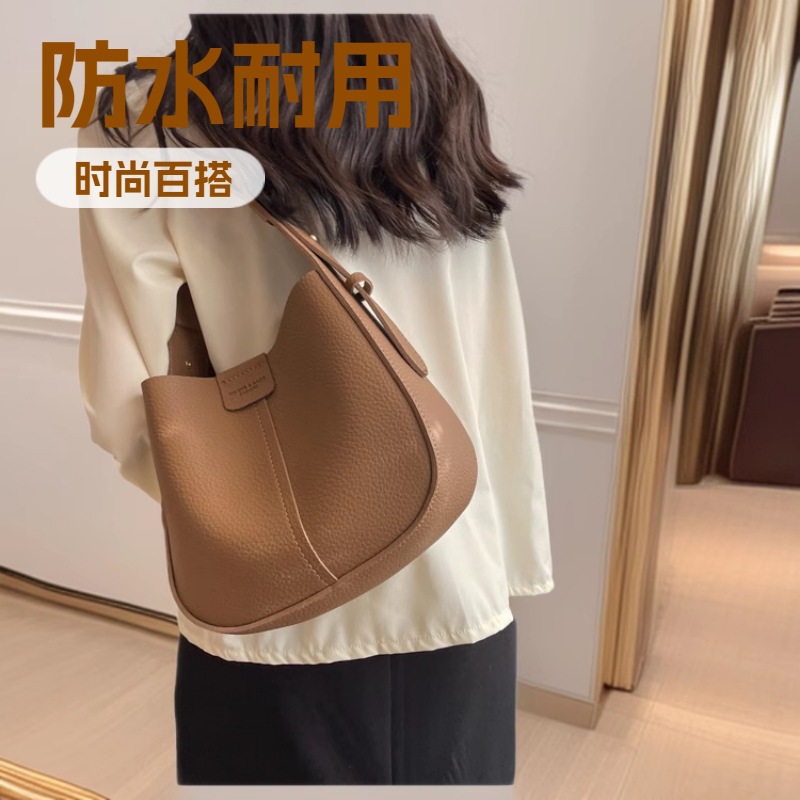 ソフトレザーのバケツ型バッグ、女性向けトレンドのショルダー/クロスボディバッグ、おしゃれなライチ柄の半円形バッグ、軽量で多用途、2025年新作
