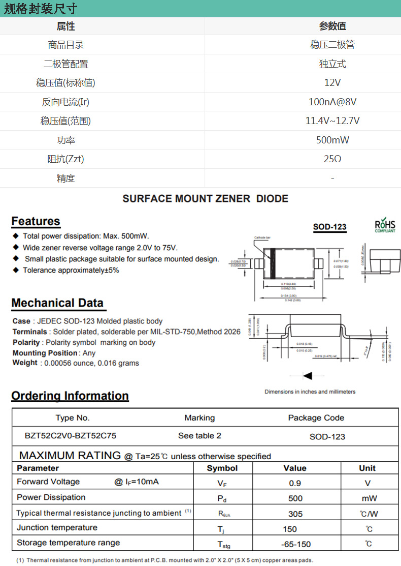BZT52C12、SOD-123 12V安定化ダイオード