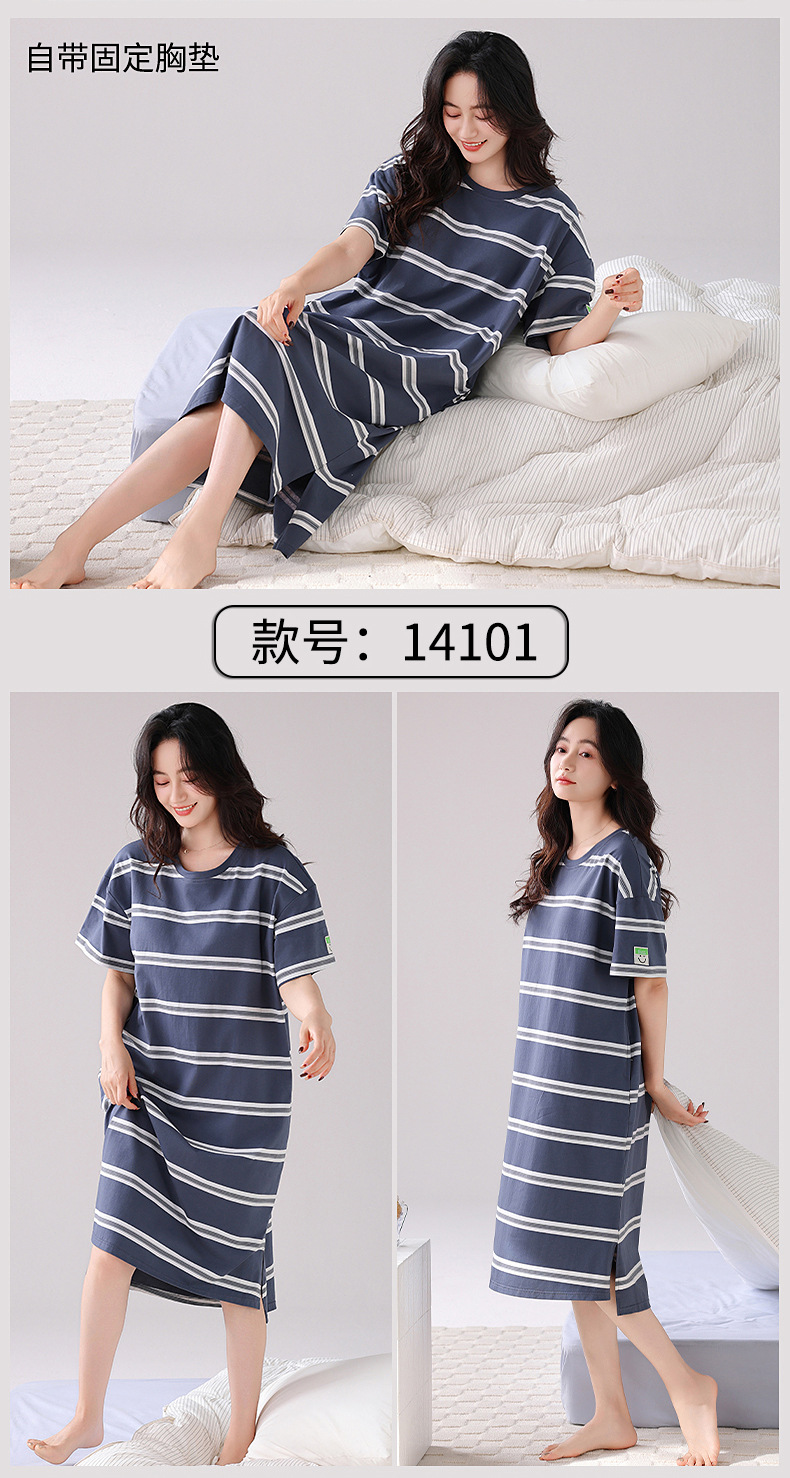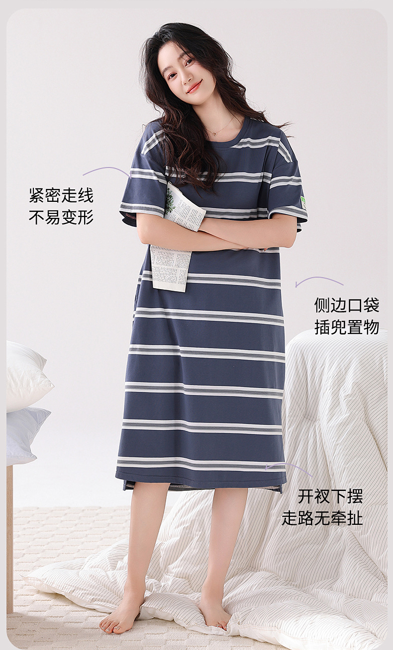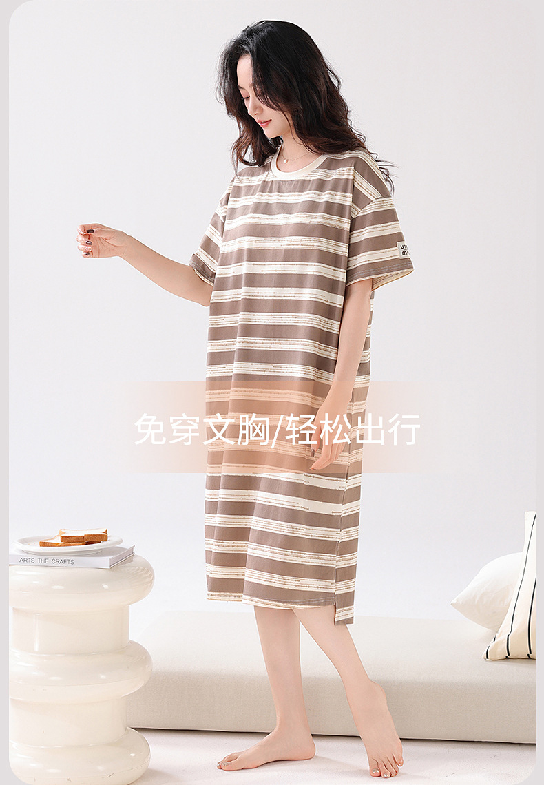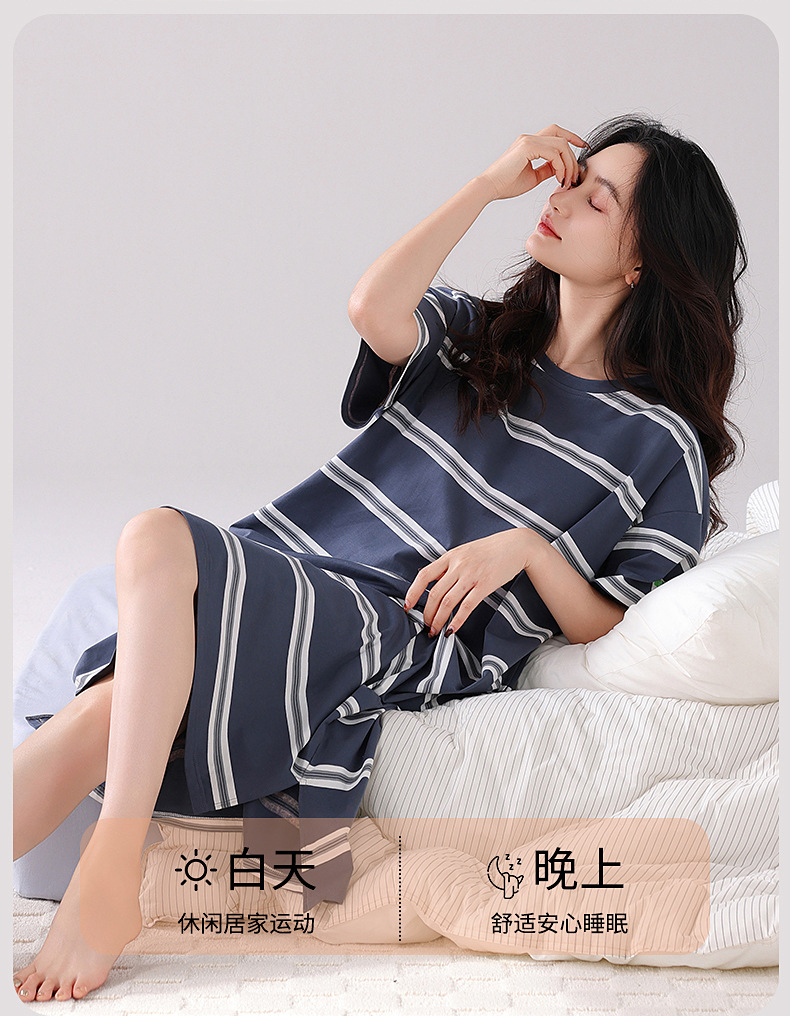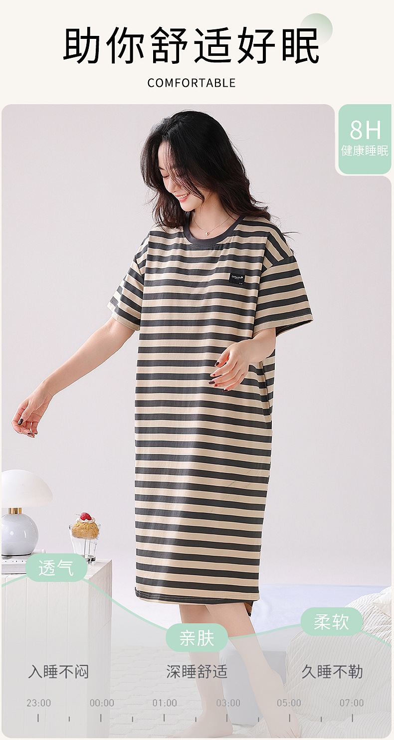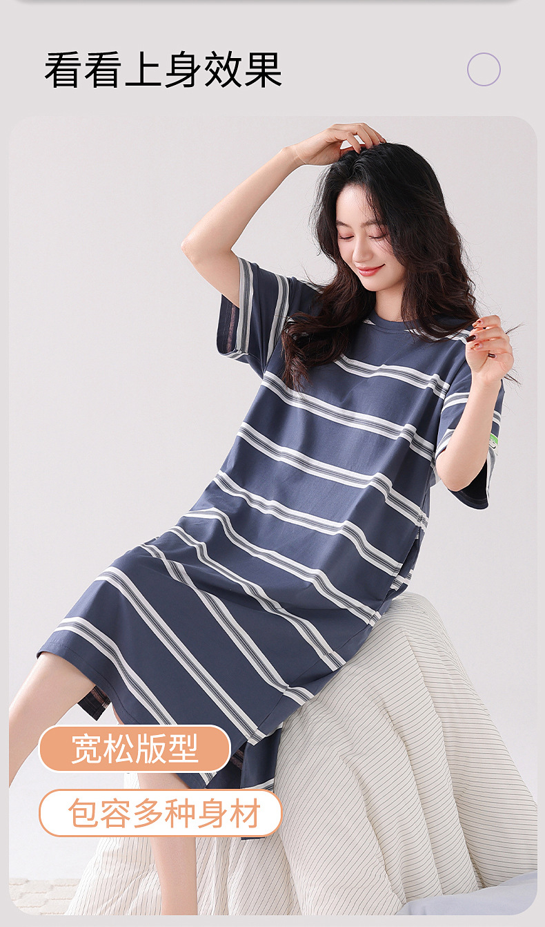 夏の新しいストライプ半袖ミドル丈レディースナイトガウン薄いフレーム純綿ラウンドネックパジャマシンプルなホームウェア