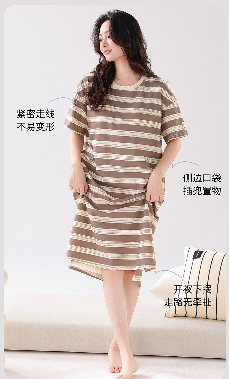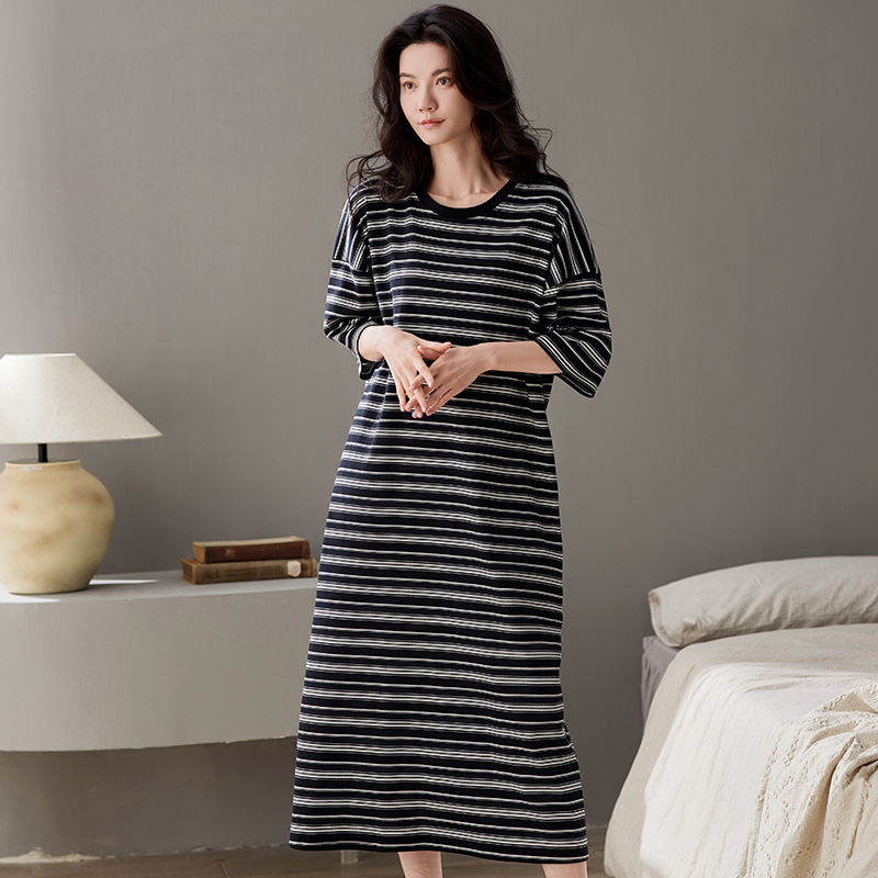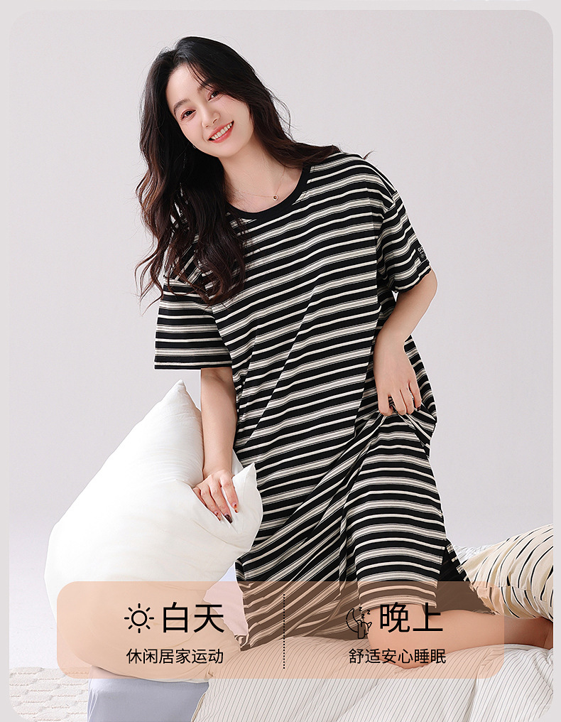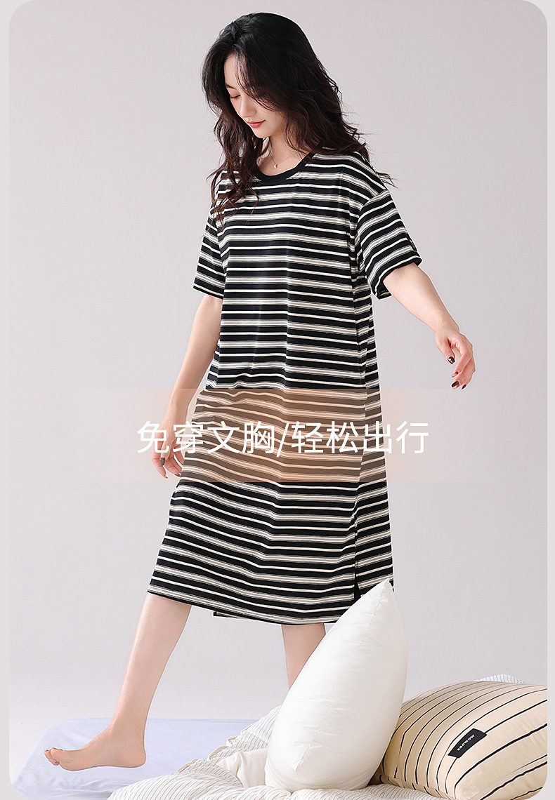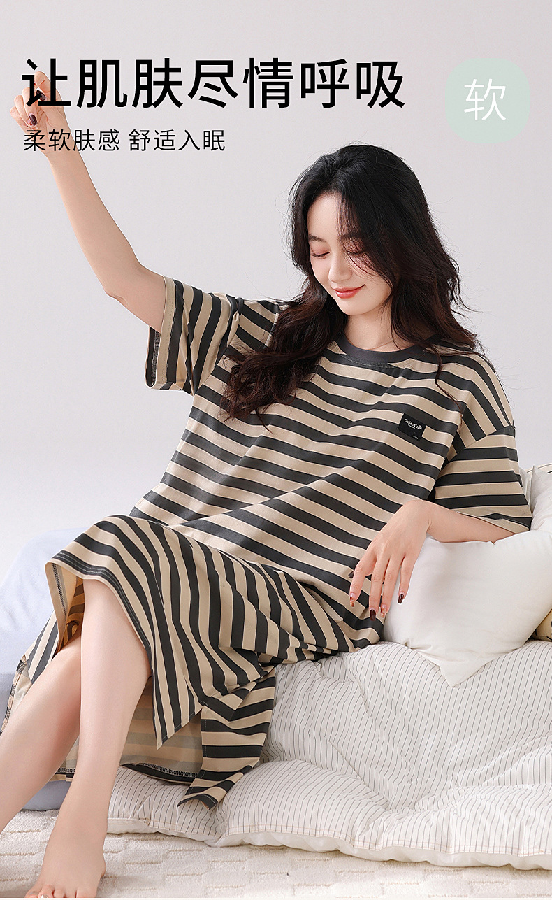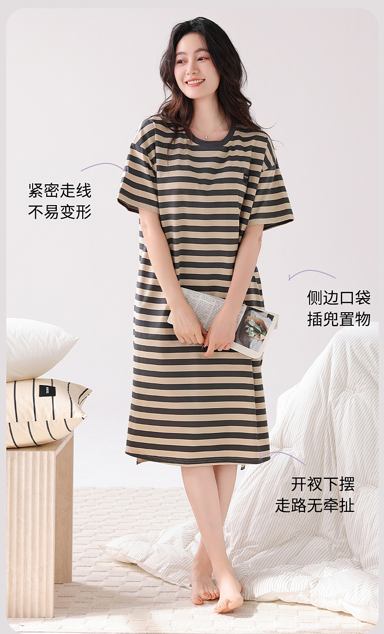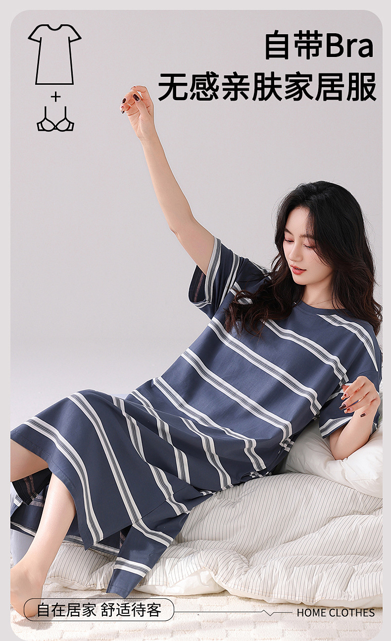 夏の新しいストライプ半袖ミドル丈レディースナイトガウン薄いフレーム純綿ラウンドネックパジャマシンプルなホームウェア