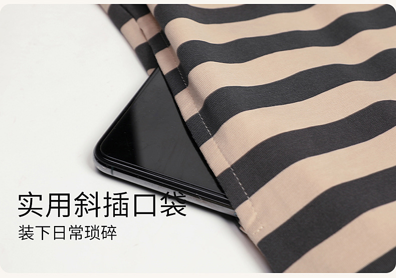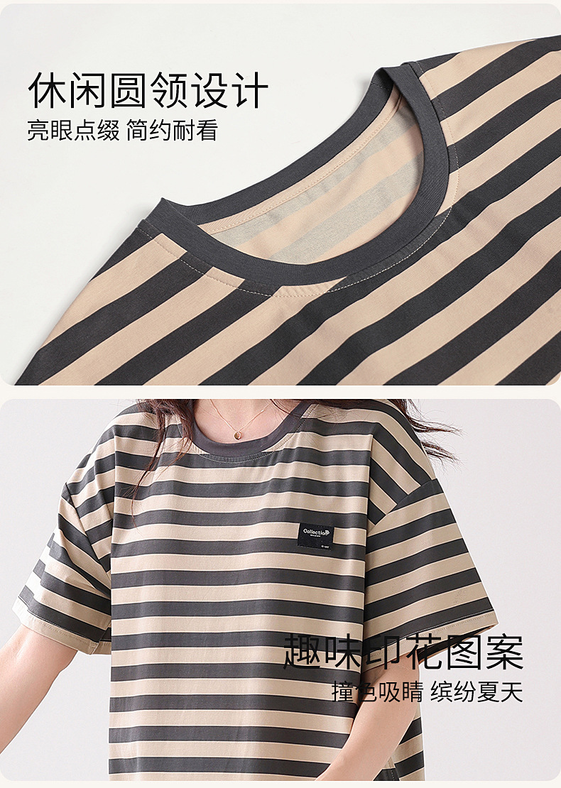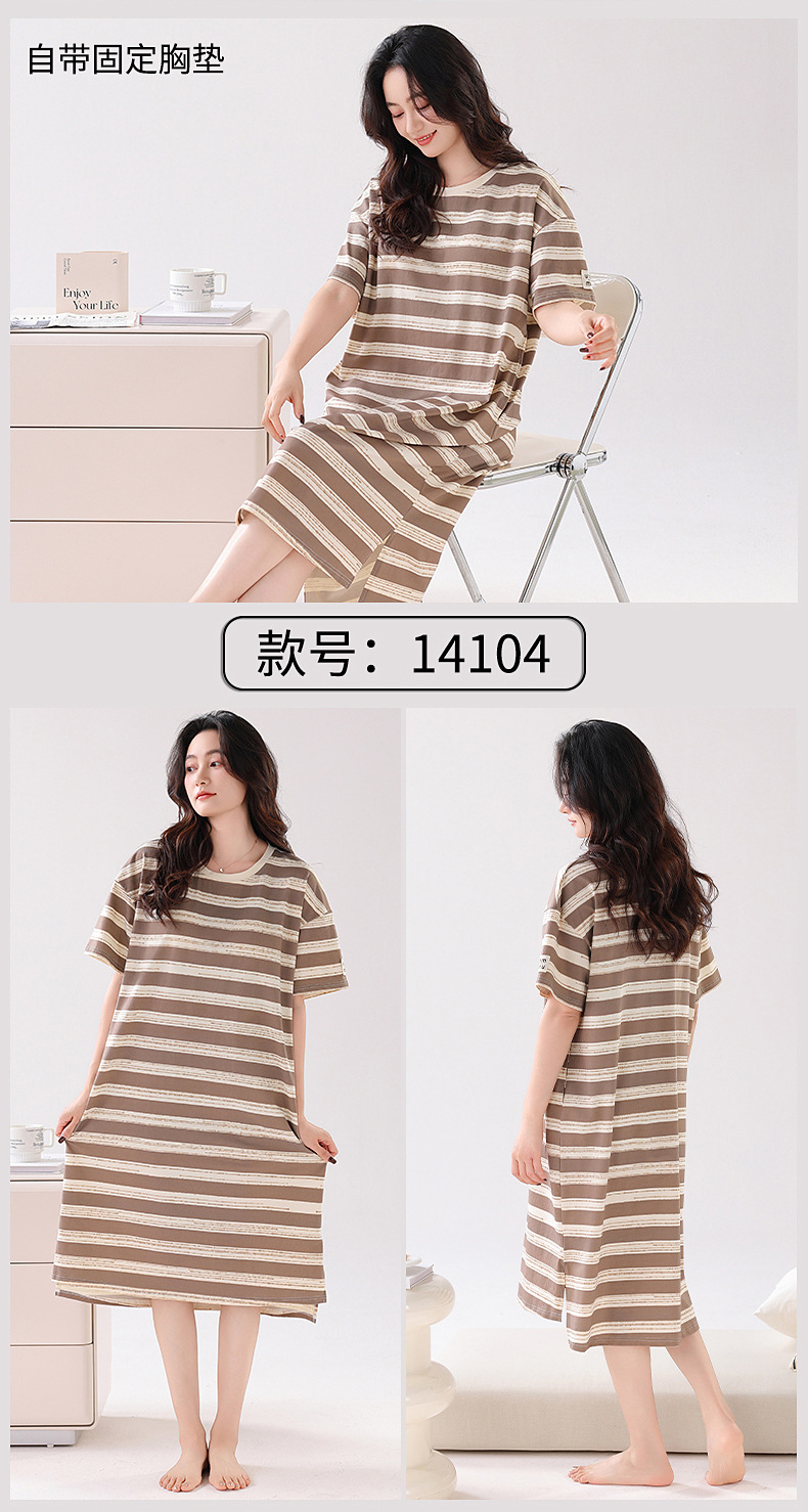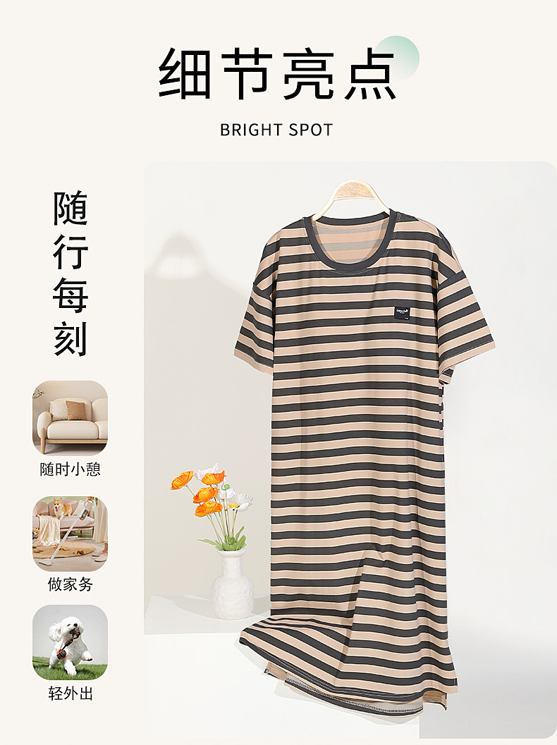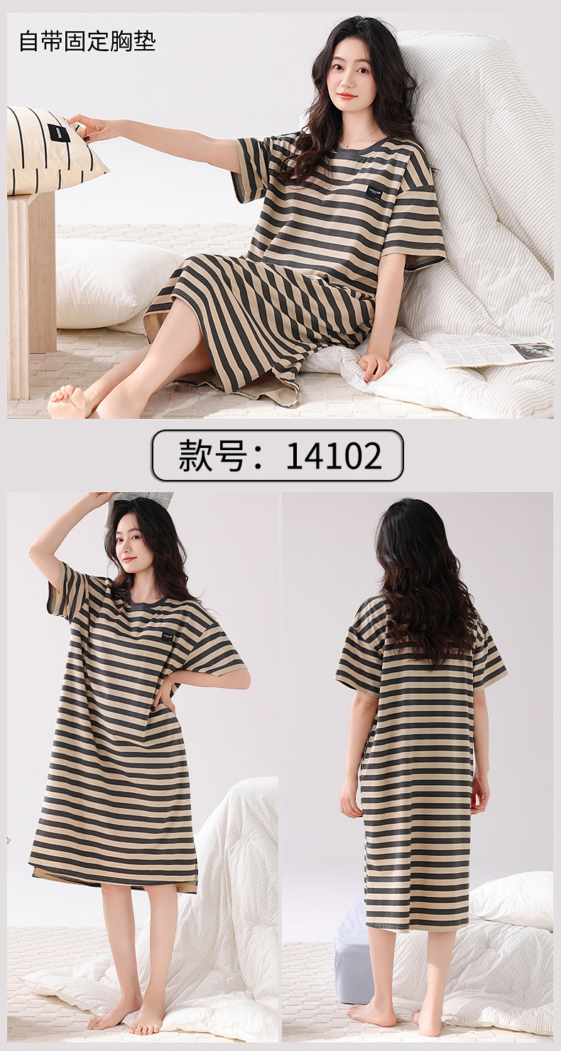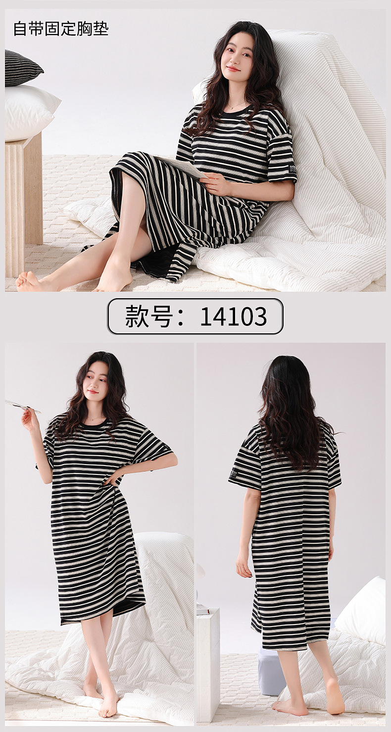 夏の新しいストライプ半袖ミドル丈レディースナイトガウン薄いフレーム純綿ラウンドネックパジャマシンプルなホームウェア