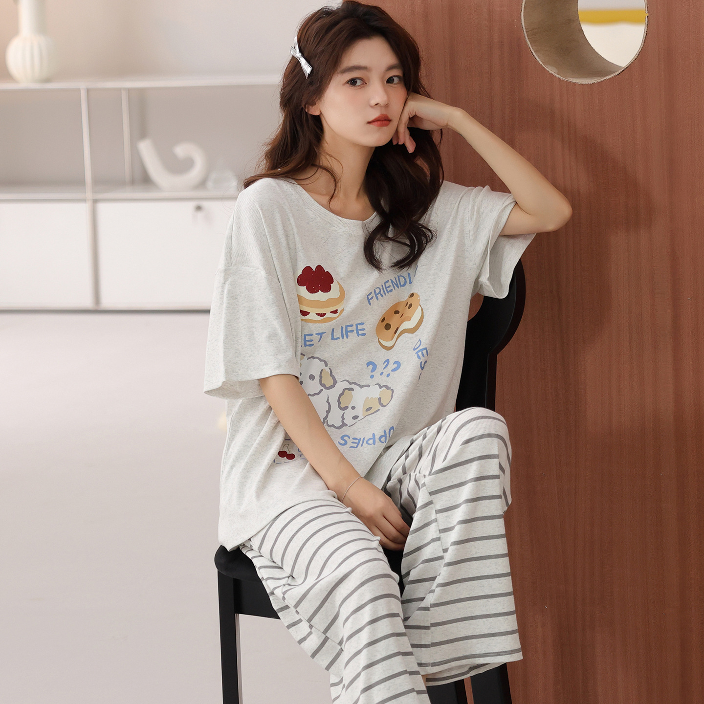 胸パッド付きモーダル糸カラーコットンパジャマ女性の夏のかわいい漫画ルーズレディース半袖ホームウェアセット