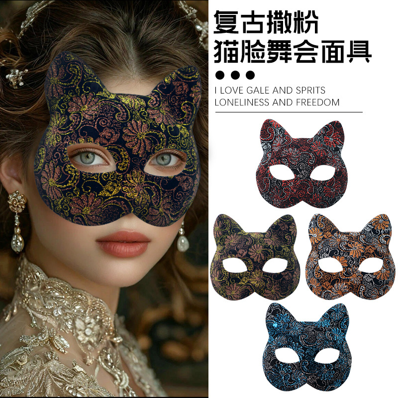 PVCコンポジット猫フェイスマスク舞踏会高级感花柄マスクコスプレパーティー衣装道具半分フェイスアイマスク