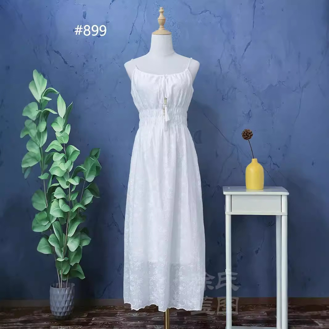 タイダイホワイトサマーホワイトドレス、爽やかで甘くてキュートなスタイル、エンボス加工ウエストサスペンダースカート、ファッショナブルな気質