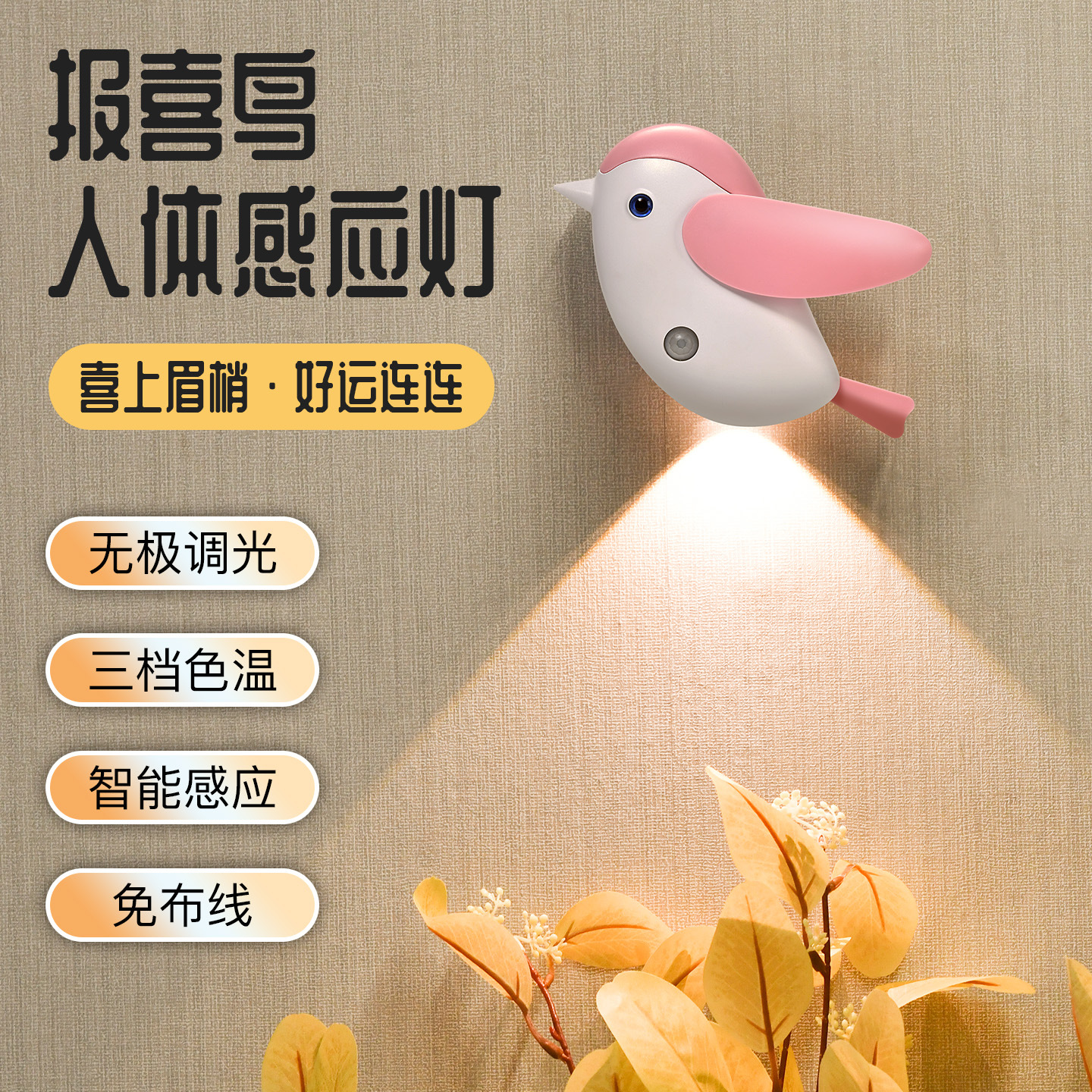 报喜鸟人体感应灯床头楼梯过道客厅照画充电池式无线壁灯中古风