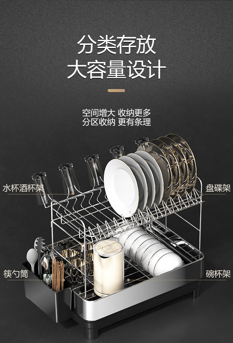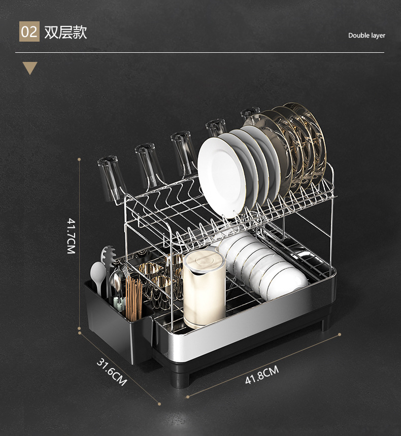 简约风厨房双层置物架 大容量多功能碗碟架 别墅餐具沥水架带托盘