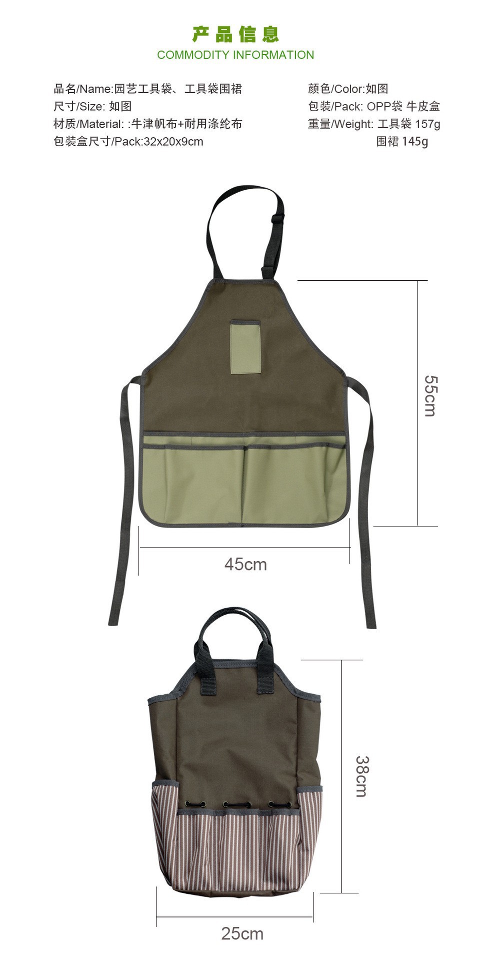 【产品尺寸】工具袋38cm*25cm 侧宽约12cm/围裙44.5cm*54cm