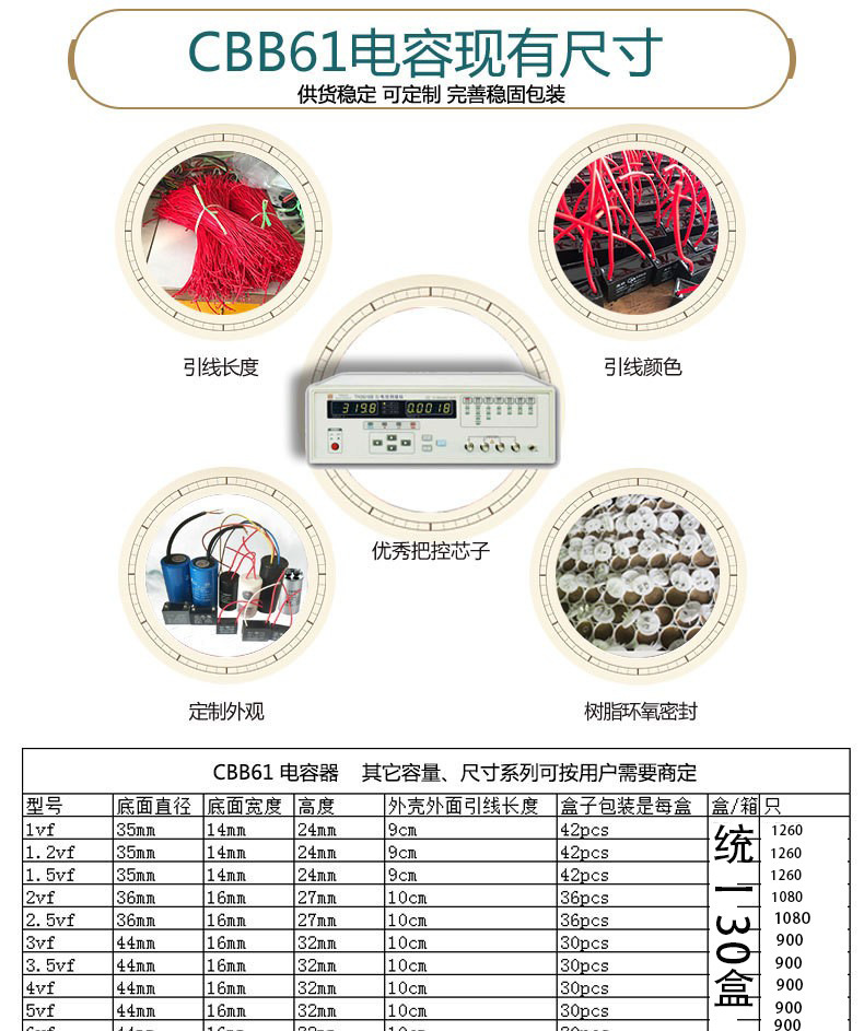 公称容量 CBB61 ダブルライン 0.8uf,CBB61 ダブルライン 1uf,CBB61 ダブルライン 1.2uf,CBB61 ダブルライン 1.5uf,CBB61 ダブルライン 2uf,CBB61 ダブルライン 2.5uf,CBB61 ダブルライン 2.8uf,CBB61 ダブルライン 3uf,CBB61 ダブルライン 3.5uf,CBB61 ダブルライン 4uf,CBB61 ダブルライン 5uf,CBB61 ダブルライン 6uf,CBB61 ダブルライン 7uf,CBB61 ダブルライン 8uf,CBB61 ダブルライン 10uf,CBB61 ダブルライン 12uf,CBB61 ダブルライン 14uf,CBB61 ダブルライン 16uf,CBB61 ダブルライン 18uf,CBB61 ダブルライン 20uf,CBB61 ダブルライン 25uf
