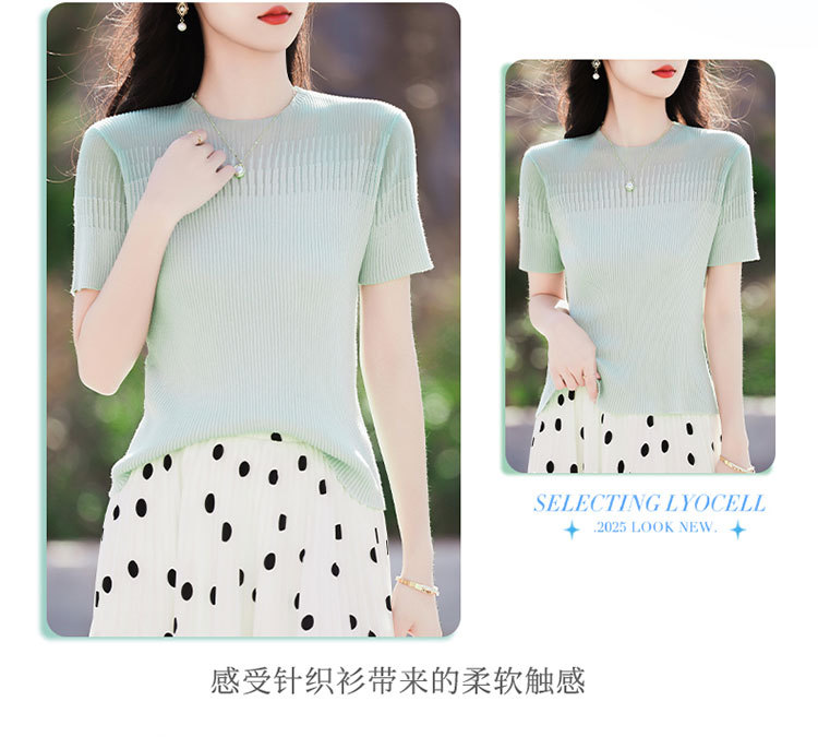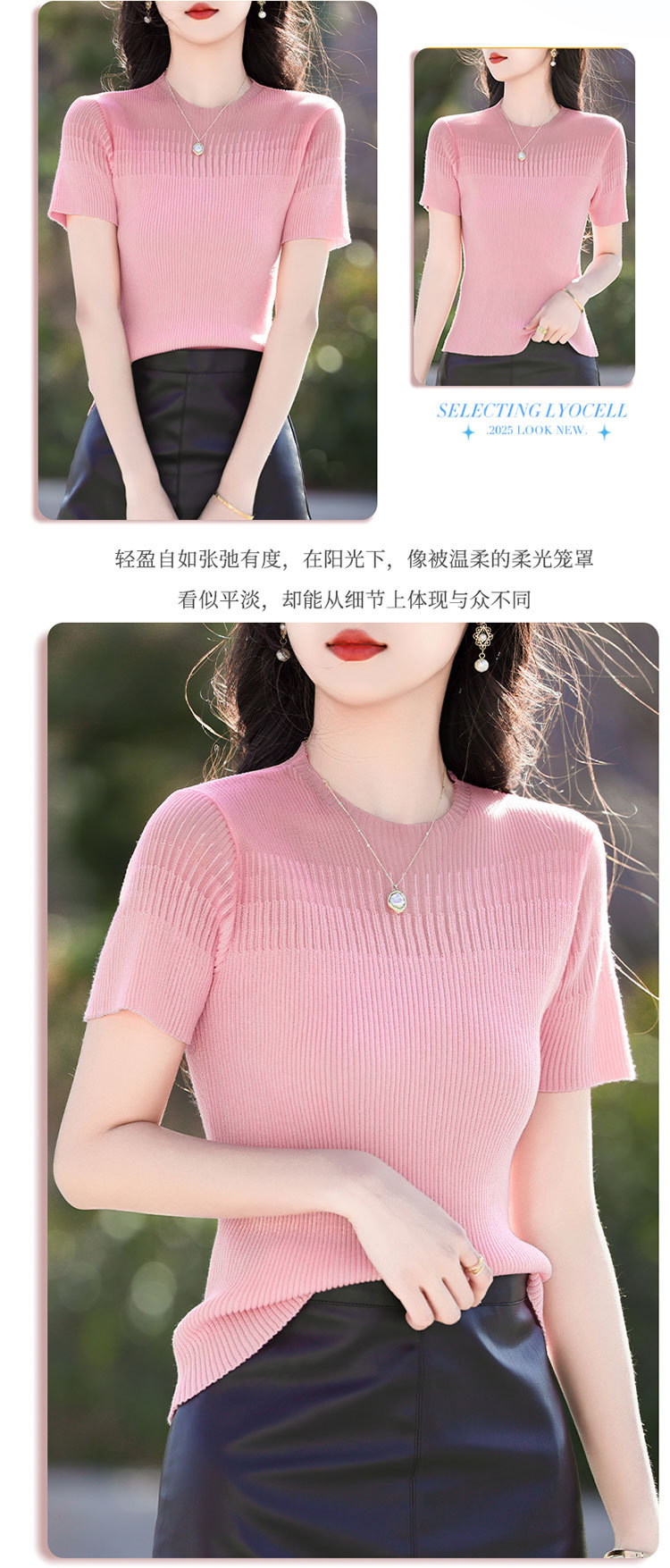 2025夏のシルクウール欧根紗亮糸半袖の新しい半高襟のニットの底の女性の修身tシャツ