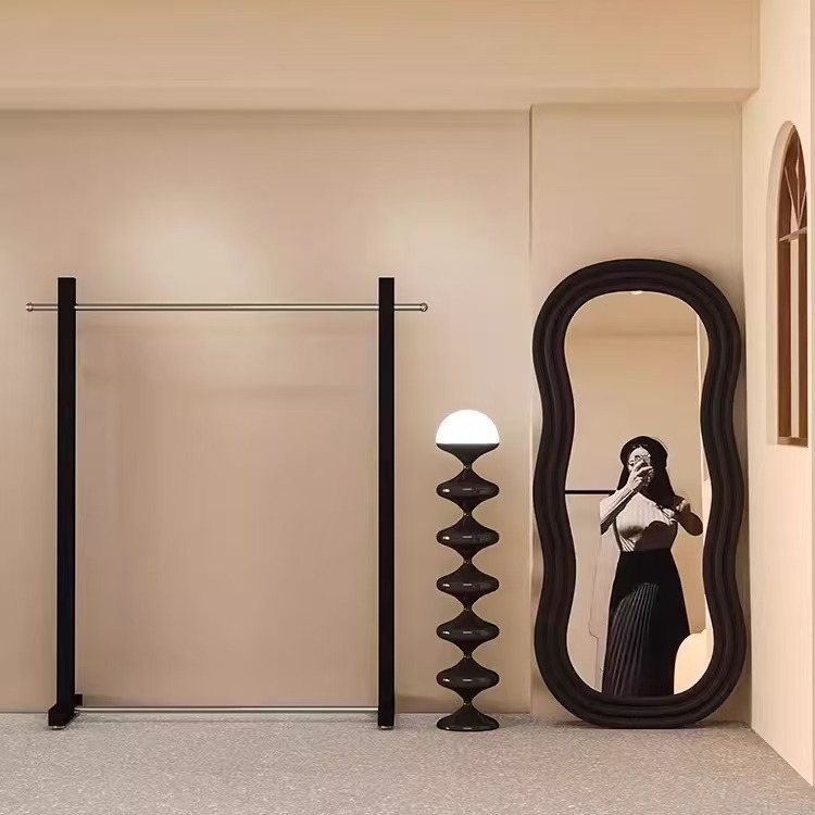 衣料品店ディスプレイラックステンレス鋼黒洋服ラック床置きディスプレイラック婦人服店特別なディスプレイ棚