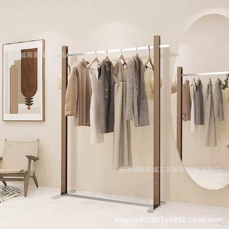 服装店展示架落地式不锈钢胡桃色陈列架女装货架中古风挂衣陈列架