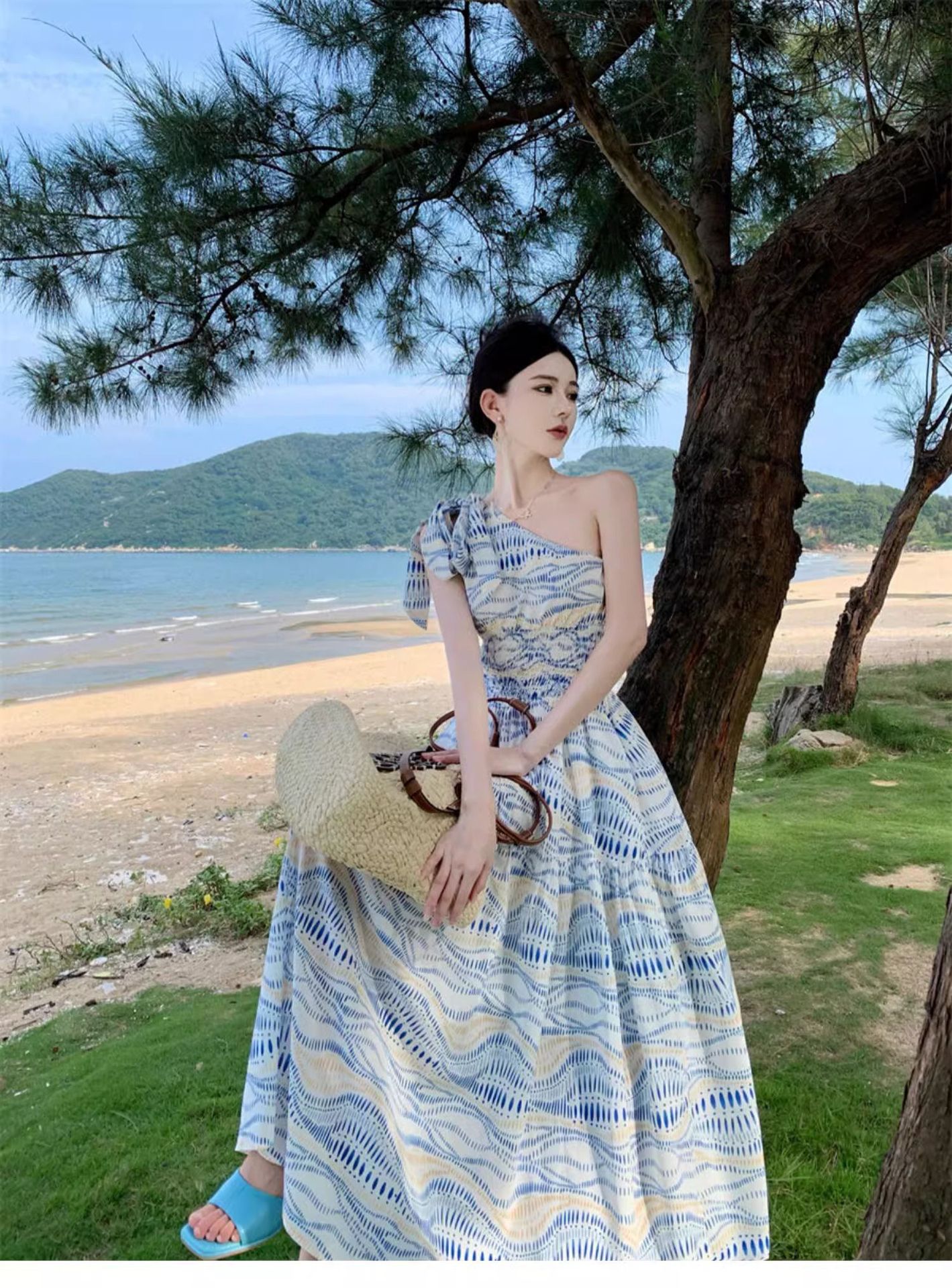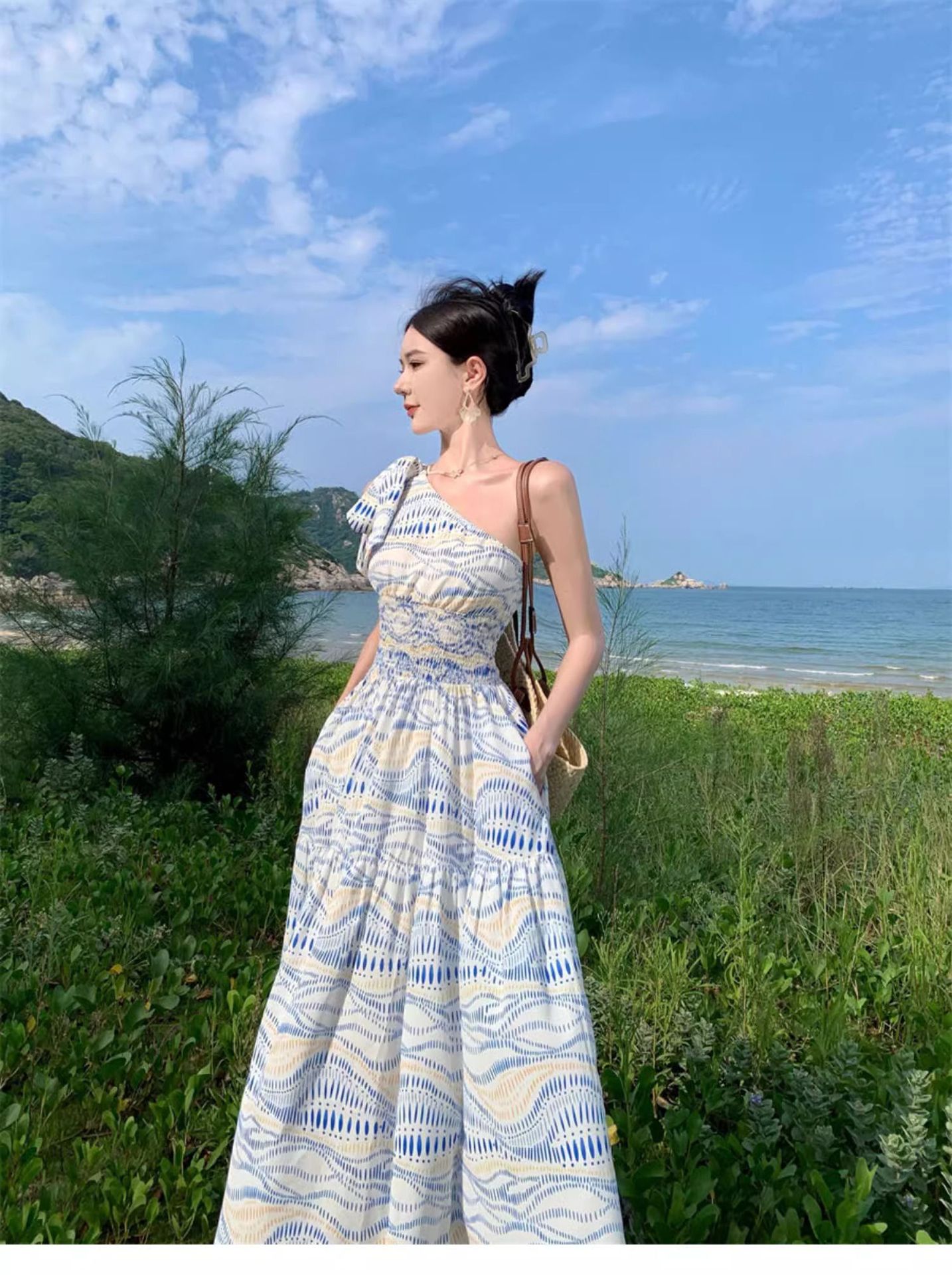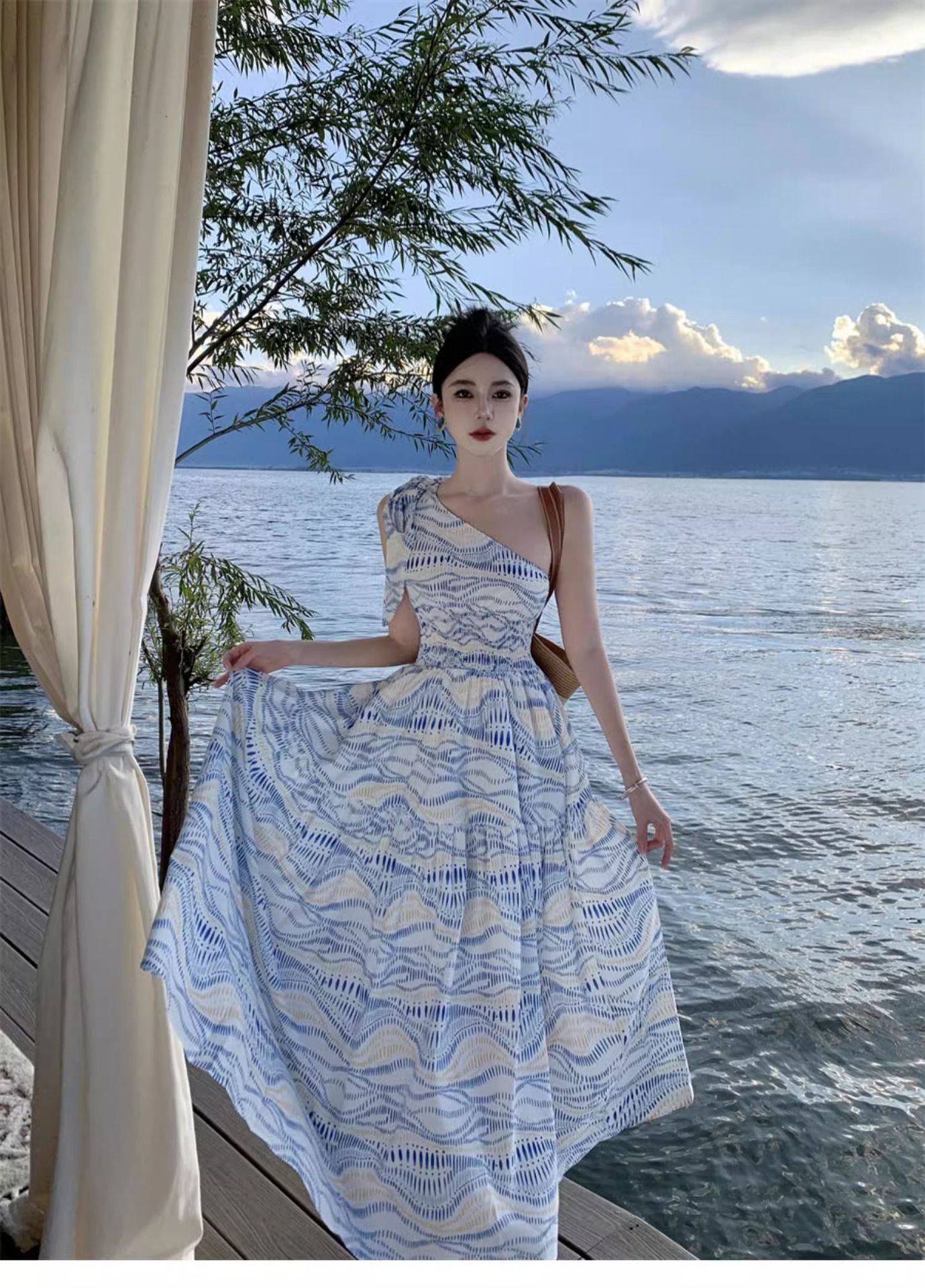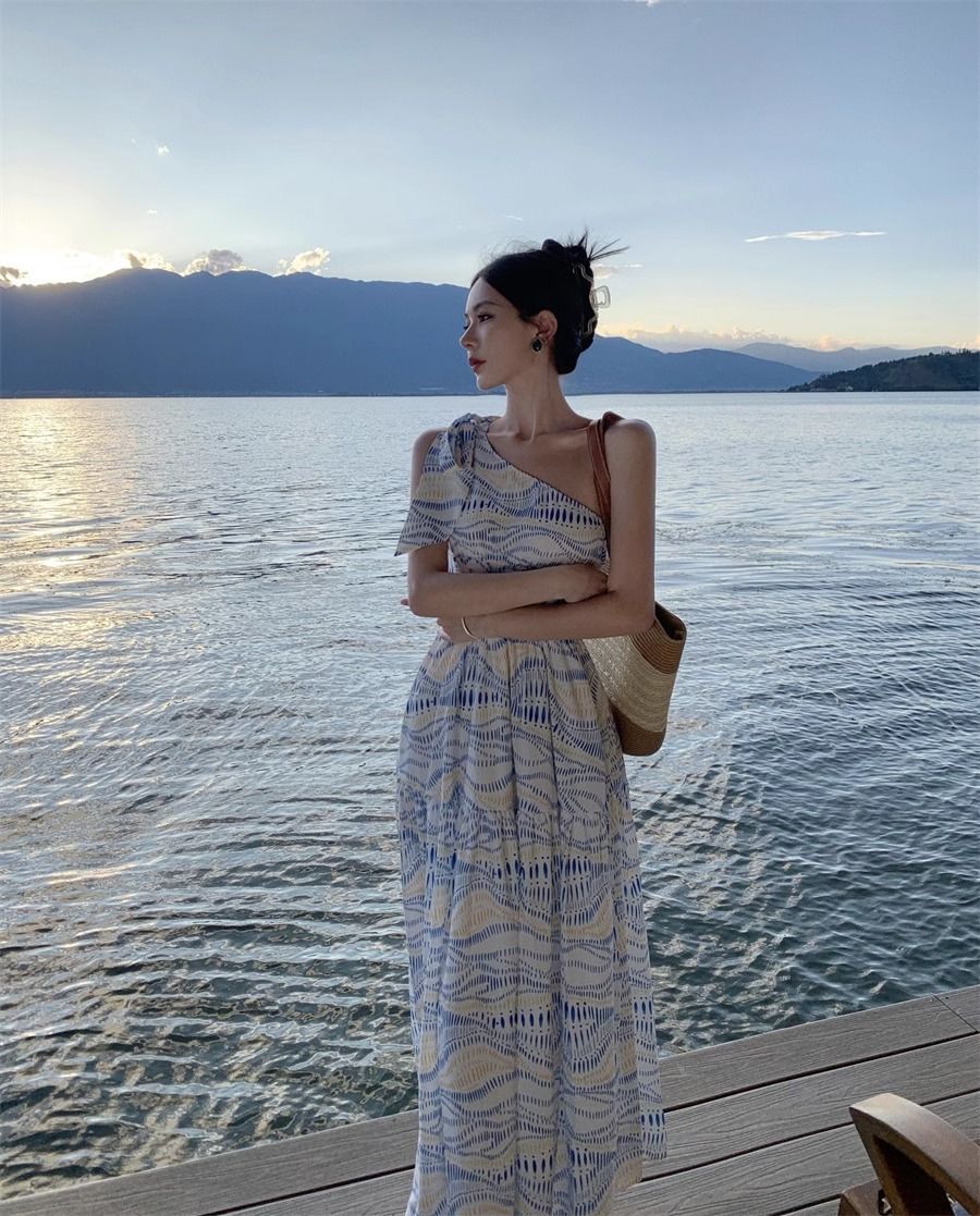 タイ旅行写真斜め肩ワンピース大衆デザイン感気質ウエストスカート三亜リゾートビーチロングスカート