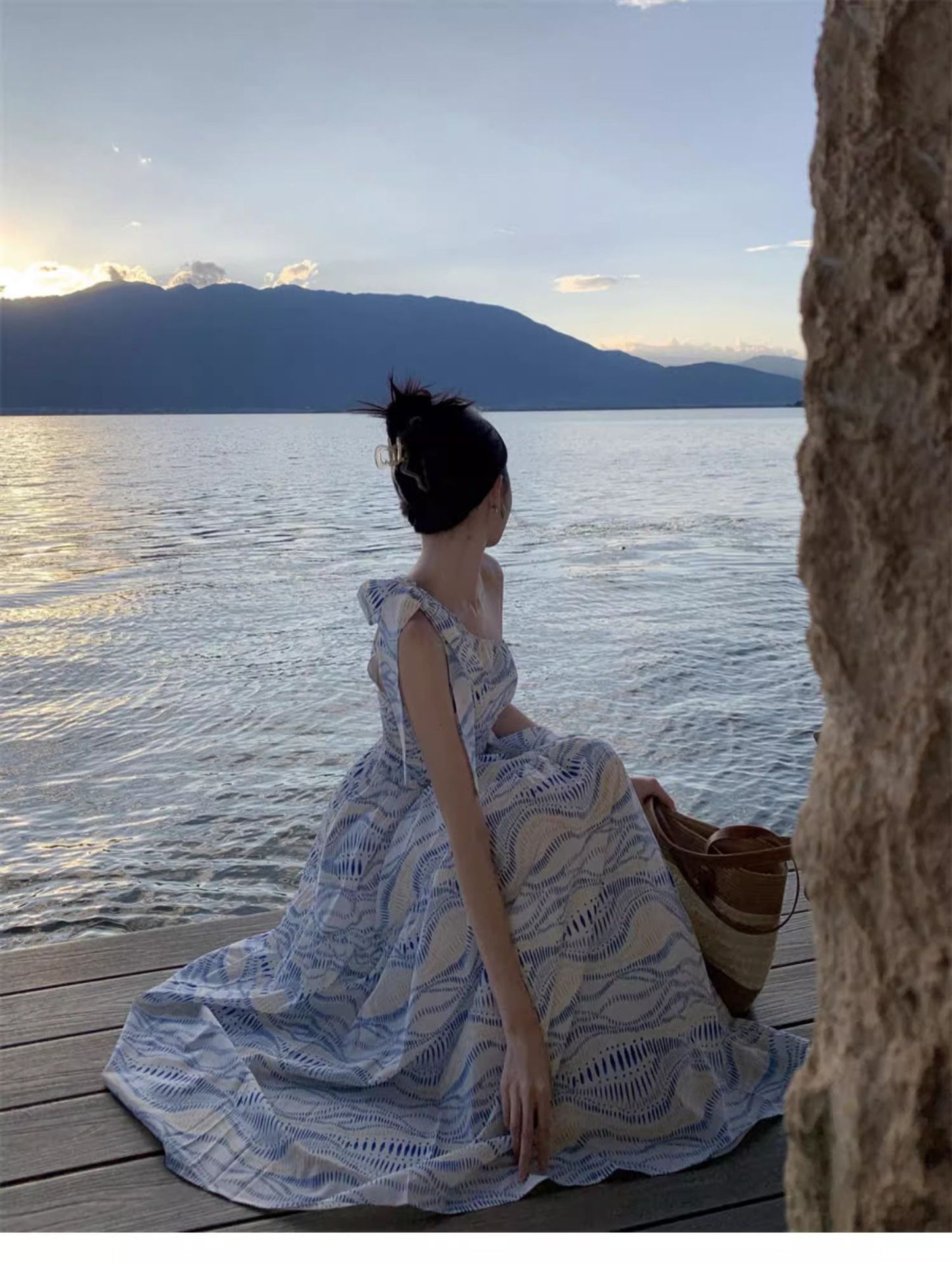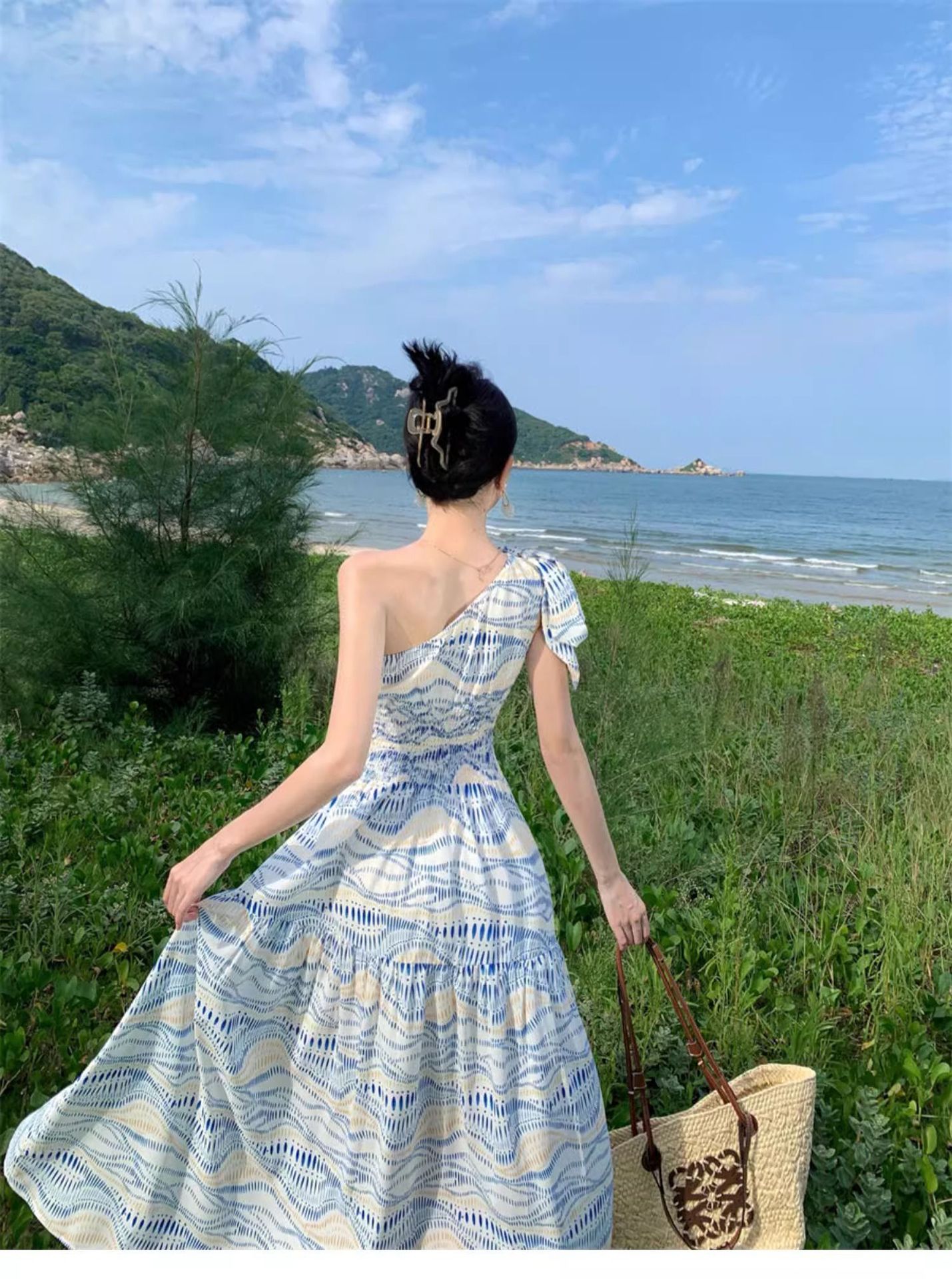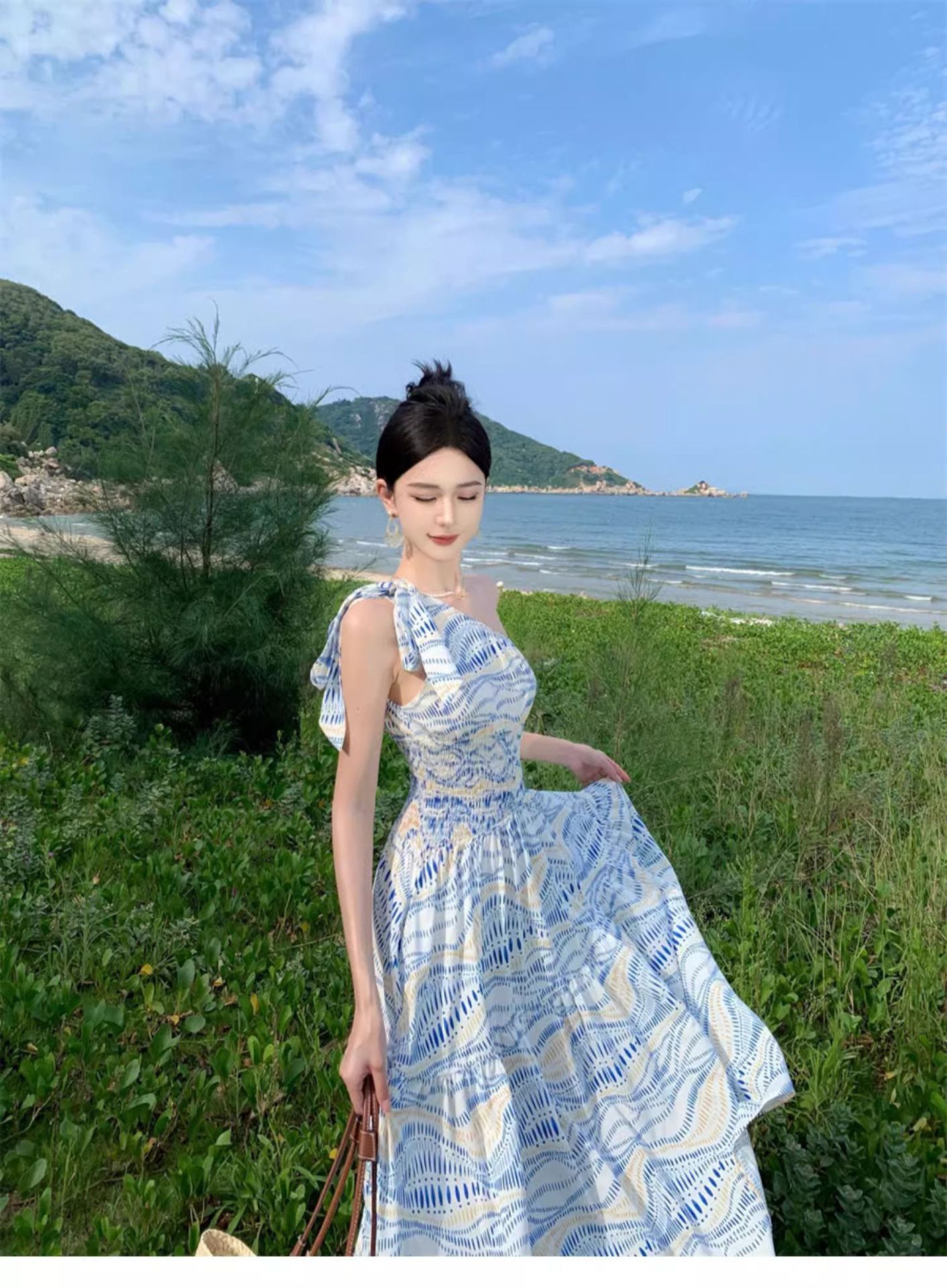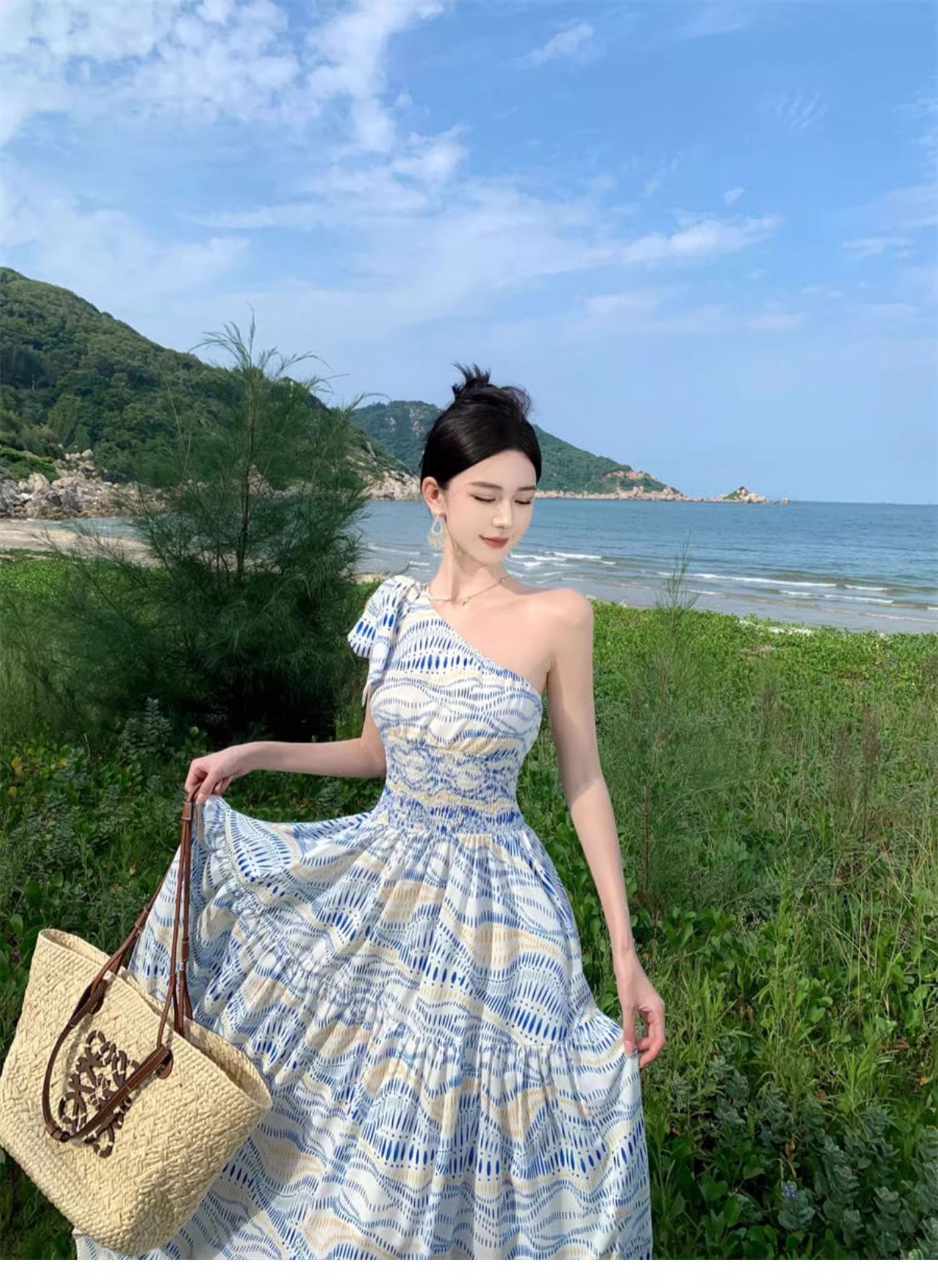 タイ旅行写真斜め肩ワンピース大衆デザイン感気質ウエストスカート三亜リゾートビーチロングスカート