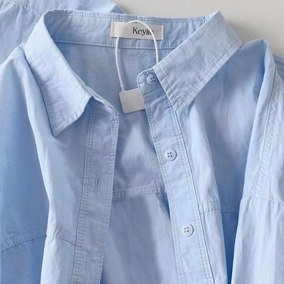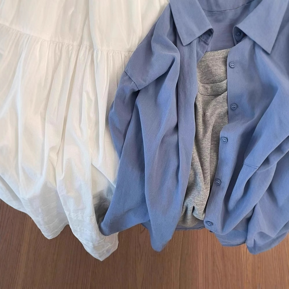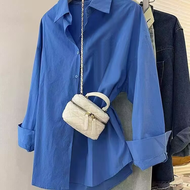 纯棉蓝色衬衫女春秋新款小清新宽松休闲百搭显瘦通勤衬衣外套上衣