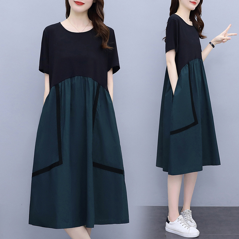 ファッションは色のワンピースの女性の2023夏の新型のシンプルなつなぎ合わせのゆったりしています。