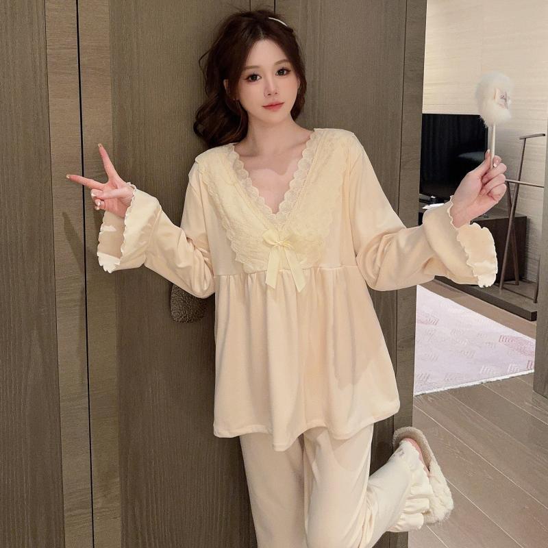 2025秋冬新作保温デロン素材マタニティパジャマ 女性用授乳服 産後服 ホームウェア レース付きラウンドネックセット