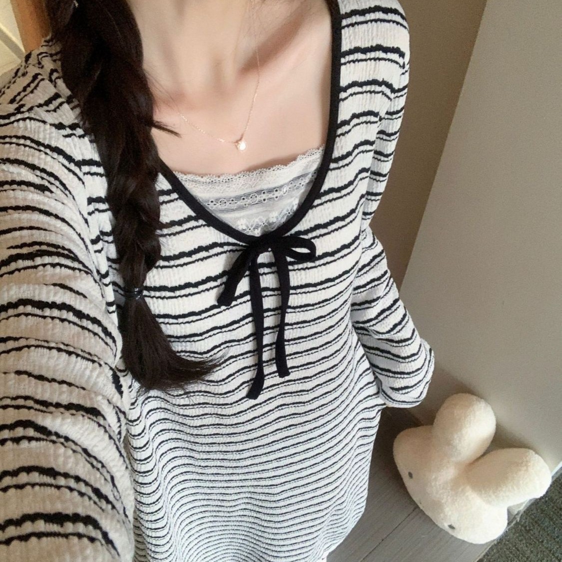 带胸垫长袖睡裙2025春秋冬新款高级感条纹宽松中长款连衣裙家居服