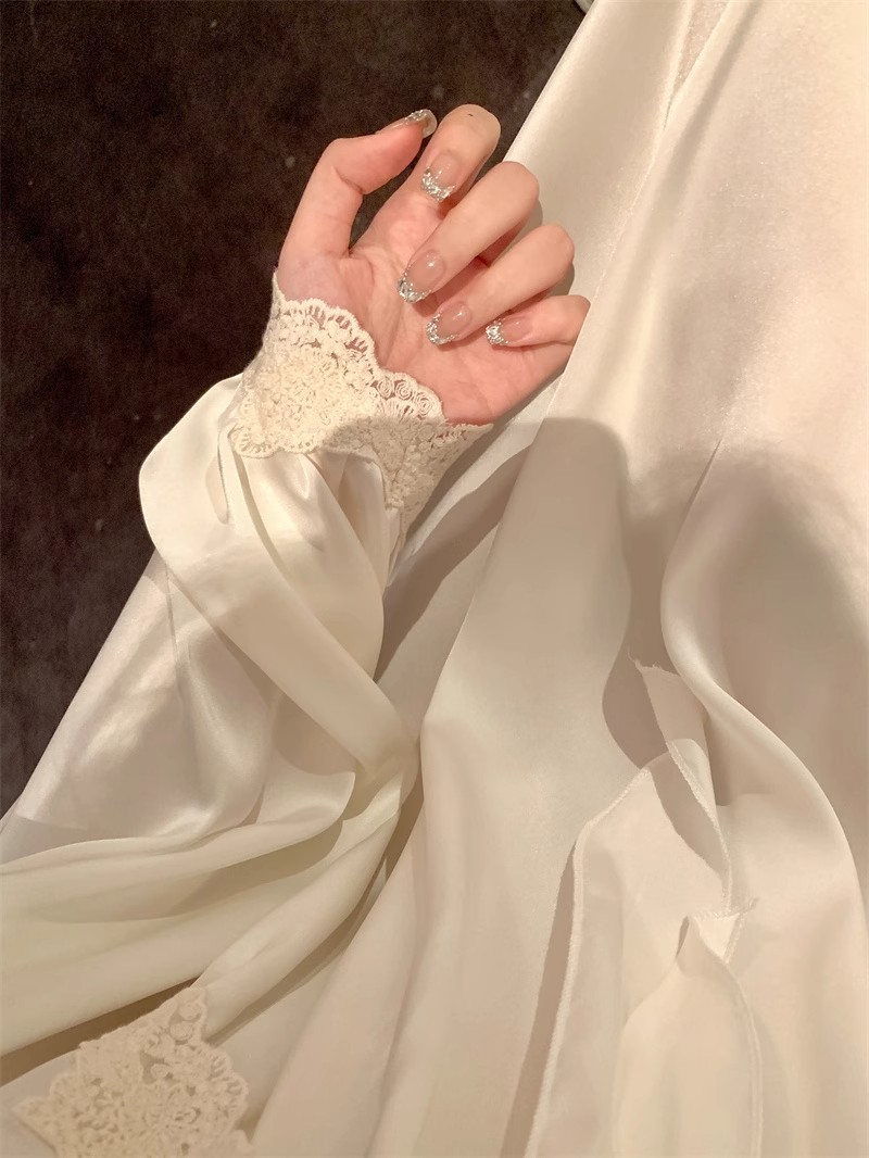 长裙带胸垫睡裙女士长袖蕾丝边V领弹力缎面冰雪丝绸睡衣超长睡裙