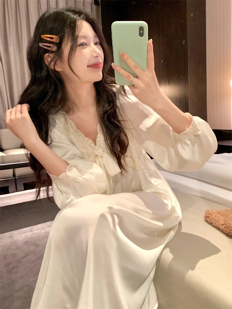 氷糸パジャマ春200斤超仙寝スカート王女甘いレース長袖ワンピース家庭服は外着できる