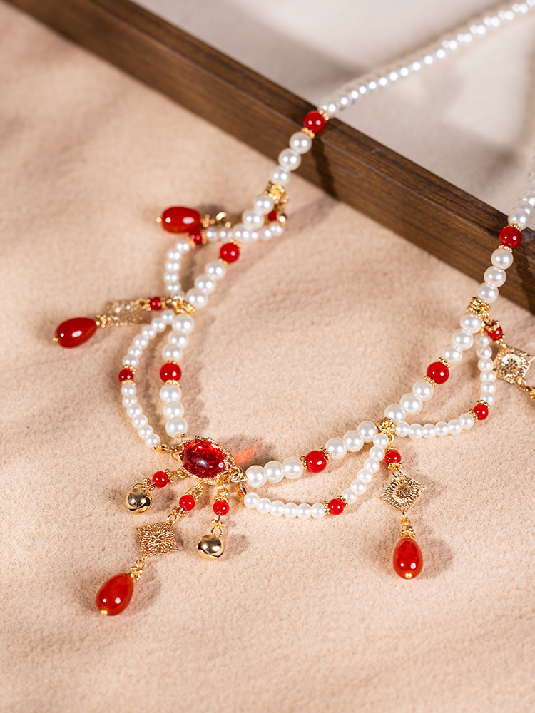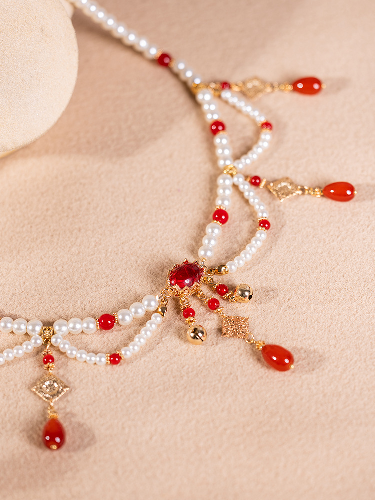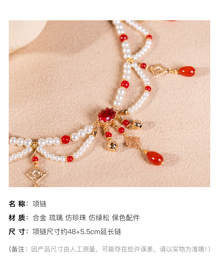古代風子供用ネックレス平安錠玉飾り漢服アクセサリー赤色模造真珠新中式国風明時代風軟玉飾り