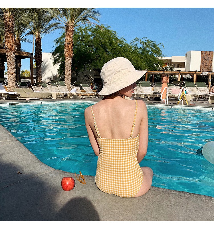 高颜値小清新純欲風少女黄青格子ワンピース水着女性2点セット肉隠れ痩せ温泉