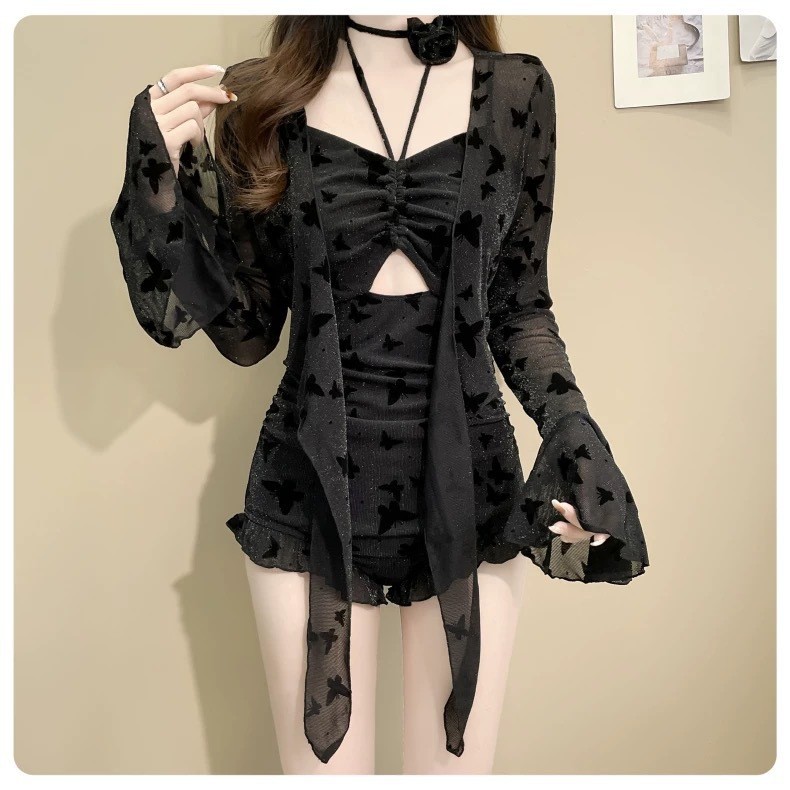 水着レディースワンピース黒セクシーレース着痩せ長袖ブラウス付き絶美高級感純欲温泉水着