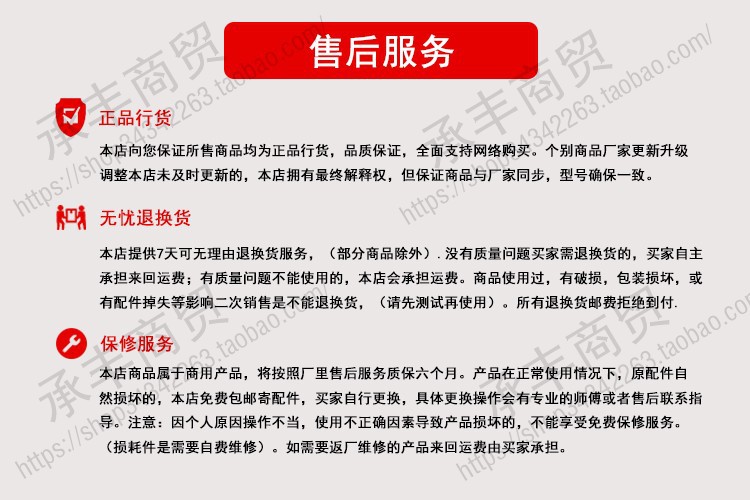 根据国家规定三包!售后服务以购买当天算起! 收到商品当日起3天之内不满意可退或更换与此同价的商品;90天内免费保修!(注:附属零件、外壳和锅胆本身没有质量问题所以不在保修范围内,坏了可在本店购买)声明:运费均由买家承担!