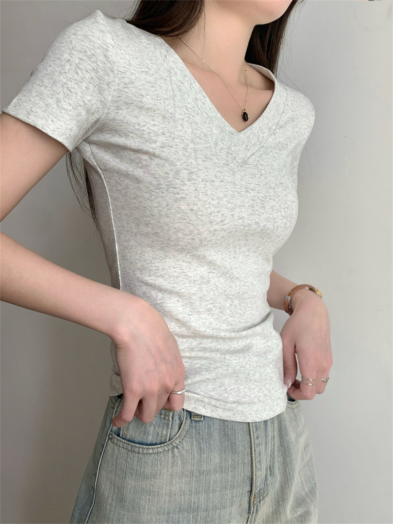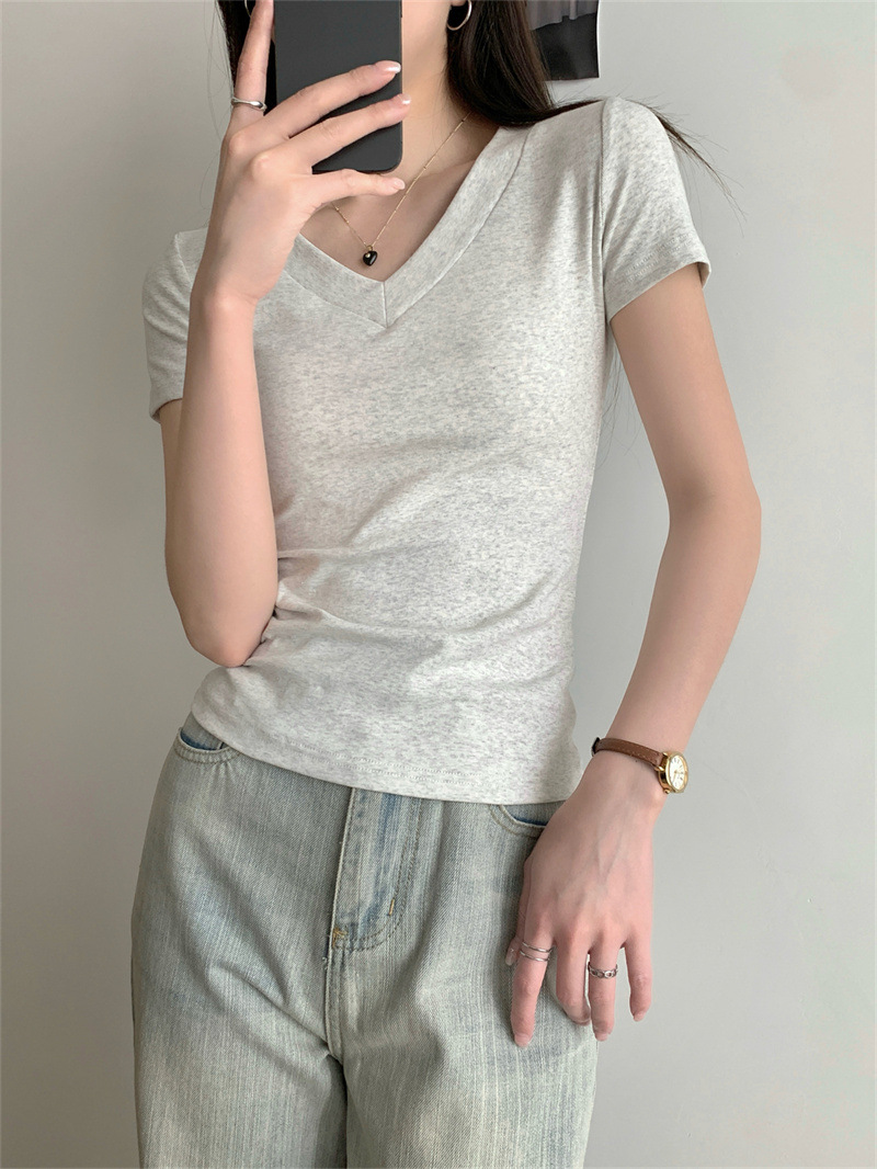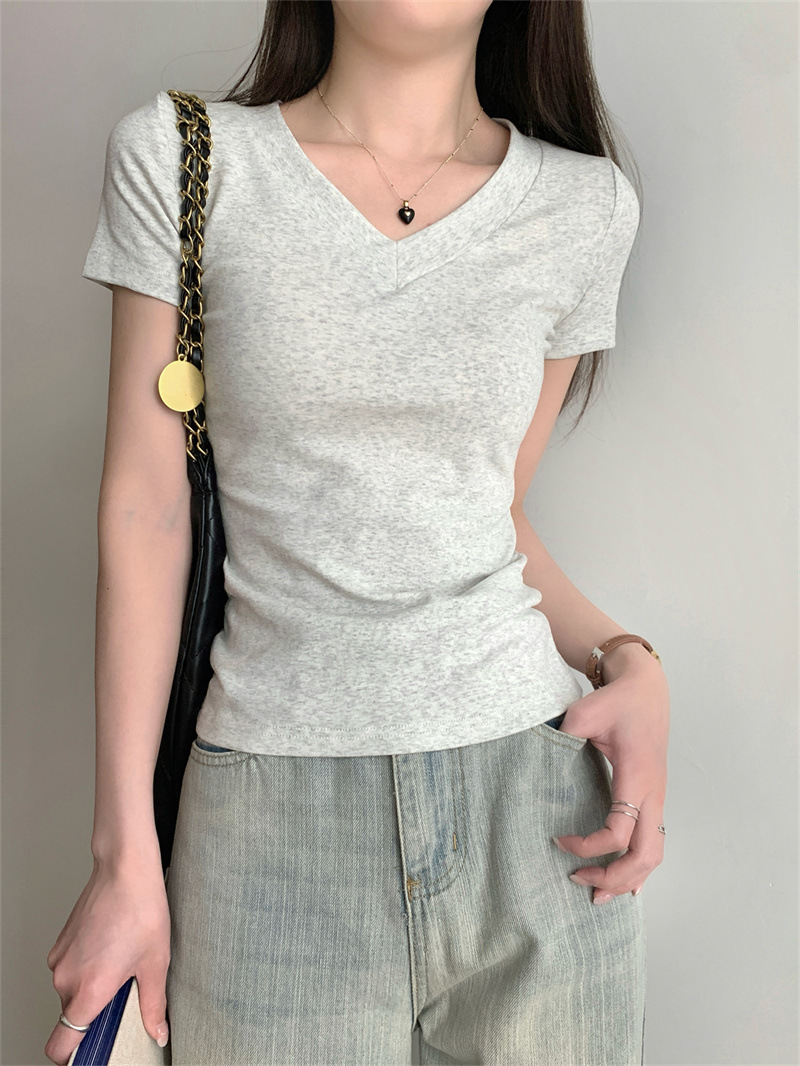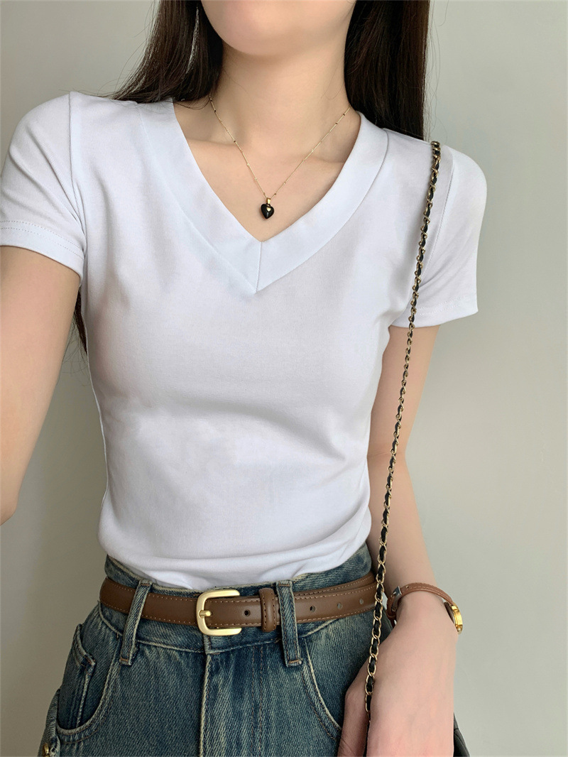 春夏の女性向けの新しい純綿右肩Vネック半袖Tシャツ、スリムで万能なアメリカンスリムトップ、インナーレイヤリングシャツ