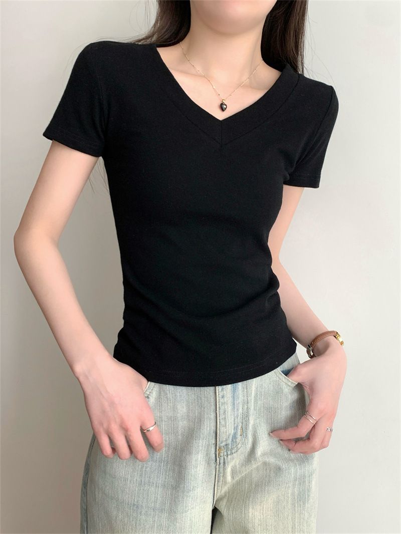 黑色v领短袖T恤女夏季修身正肩打底衫内搭纯棉上衣2025新款