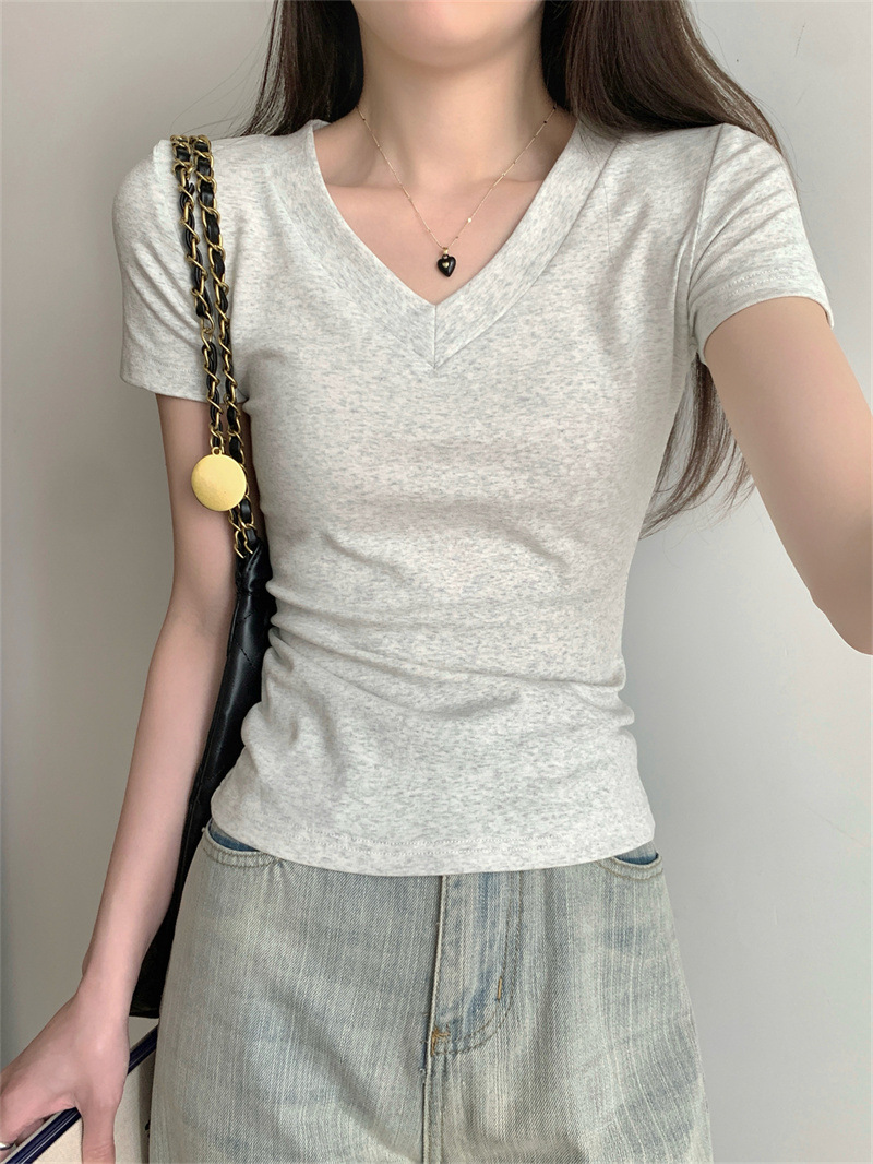 正肩vネック半袖t女綿夏2025年新型修身ウエストを締めて底を打って痩せた上着を見せます。