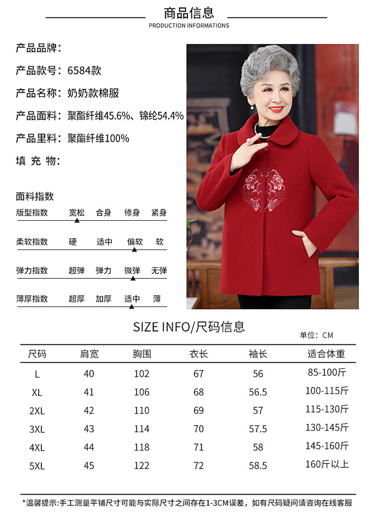 お年寄りのダウンジャケットの女性の短いタイプの本命年のお母さんの冬服の綿入れの上着の老人の唐服のおばあさんの冬の綿入れの上着