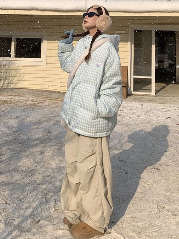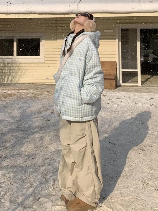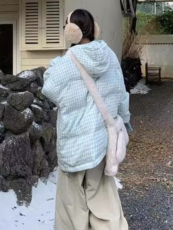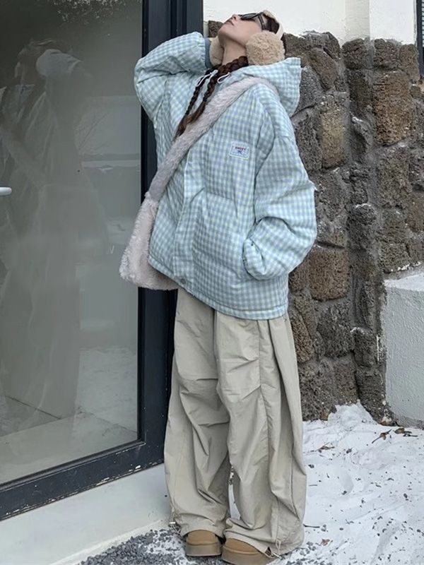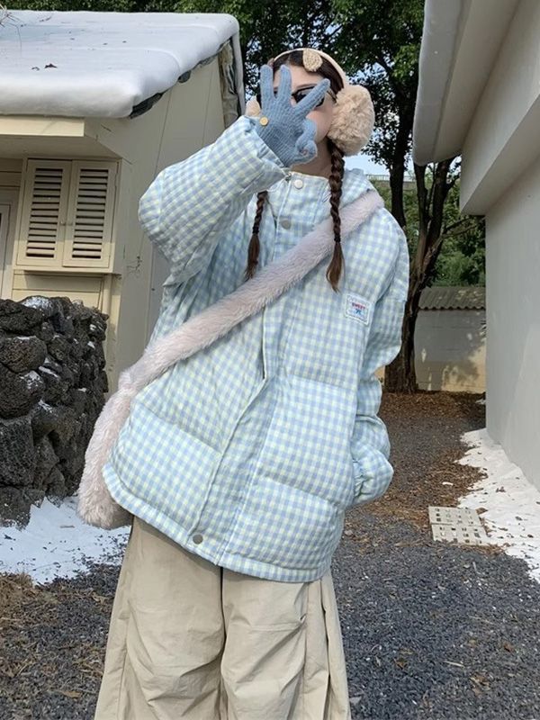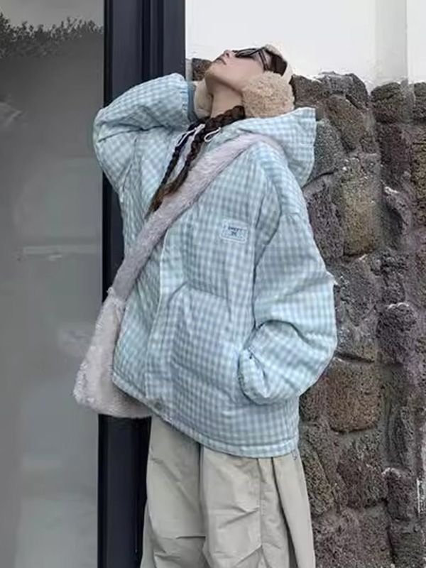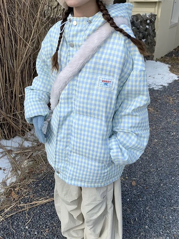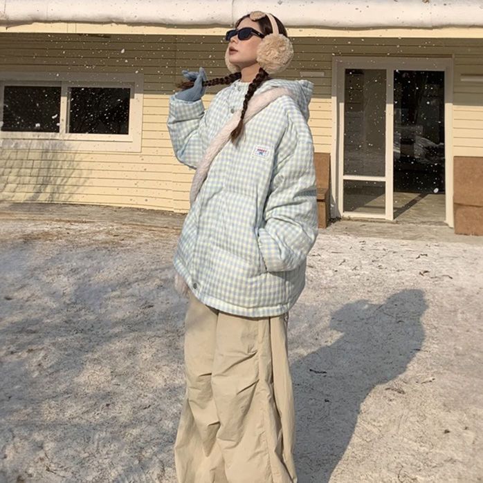 韓系の復古風のファッション的な格子縞は帽子まで綿の服の保温のパンの服をつづり合わせて厚く保温のコートを結びます。