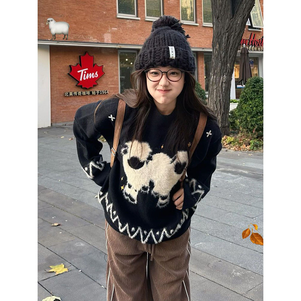 韓国版のファッションの甘い趣味の子羊のジャカードの黒色の保温のセーターの女性の秋冬の新型のゆったりしているニットのファッション