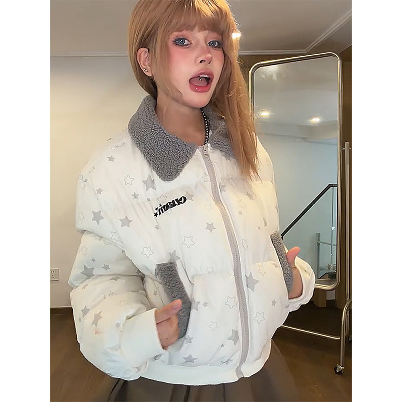 美式复古星星羊羔毛翻领棉服女冬季短款小个子加厚保暖棉衣面包服