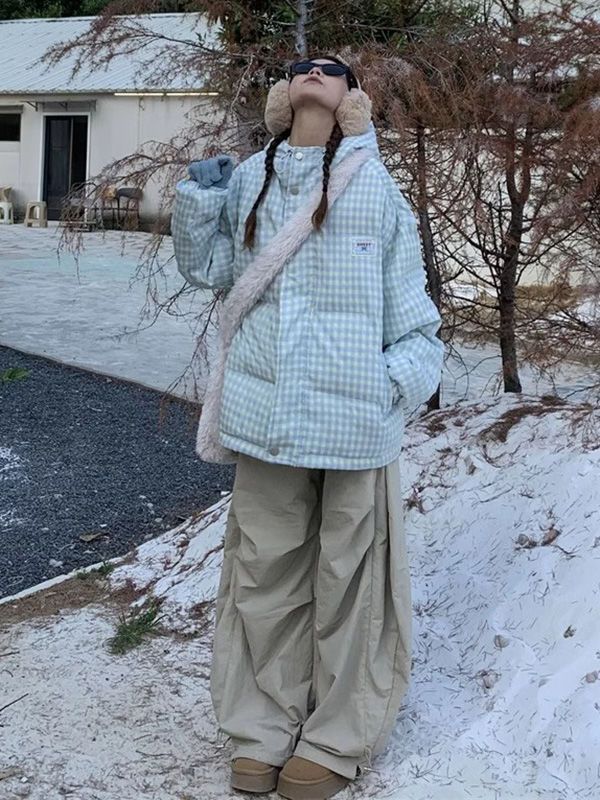 美式复古粉色格子撞色字母刺绣双面穿棉服女冬季新款加厚棉衣外套