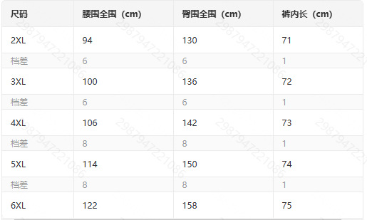 パンツのサイズ 2XL,3XL,4XL,5XL,6XL