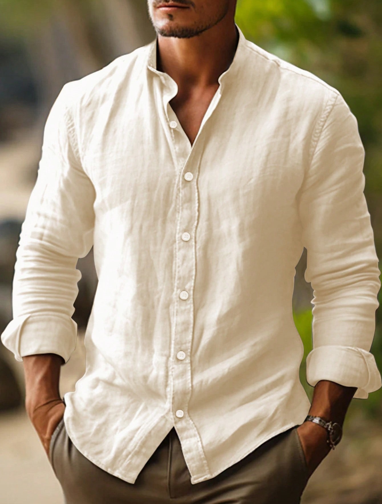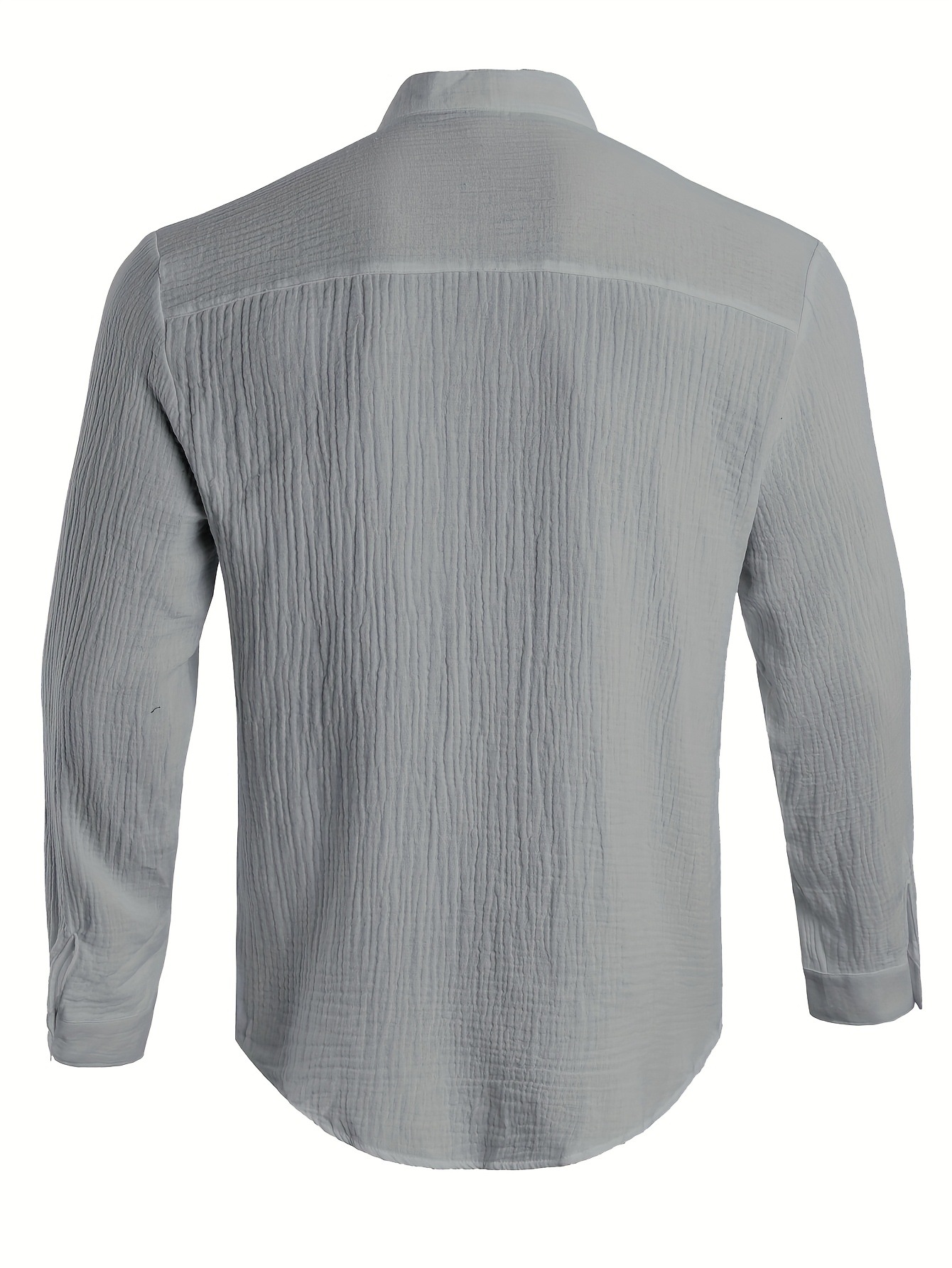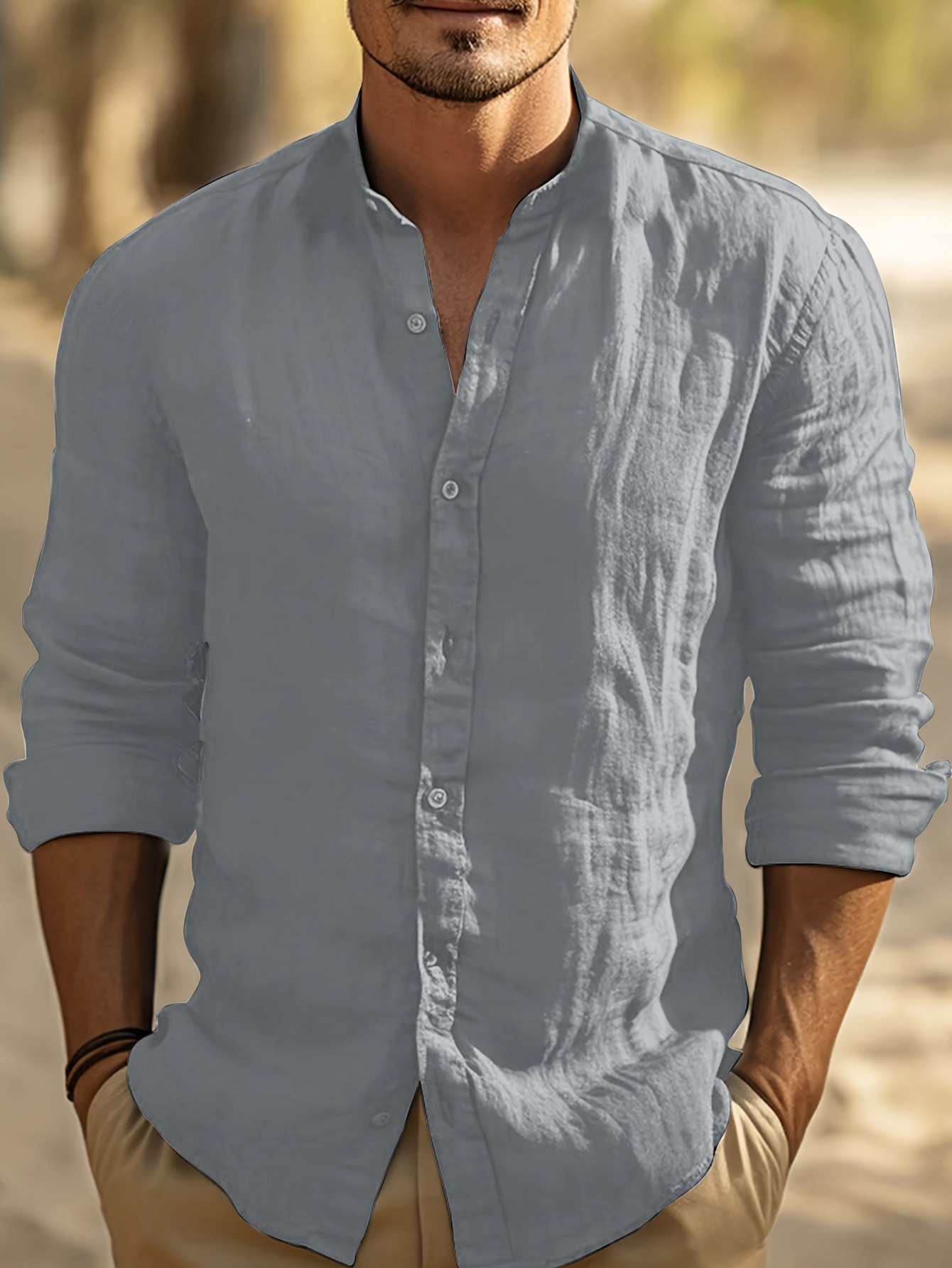 クロスボーダーメンズリネン系バックルシャツ夏ビーチシャツ長袖無地スタンドカラー春夏カジュアル日常着