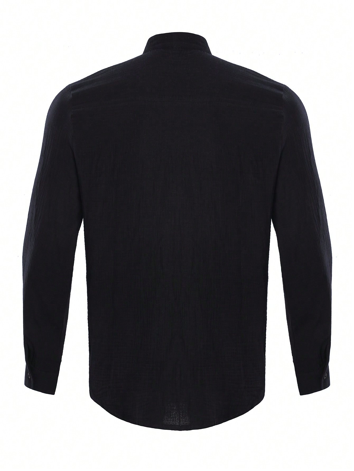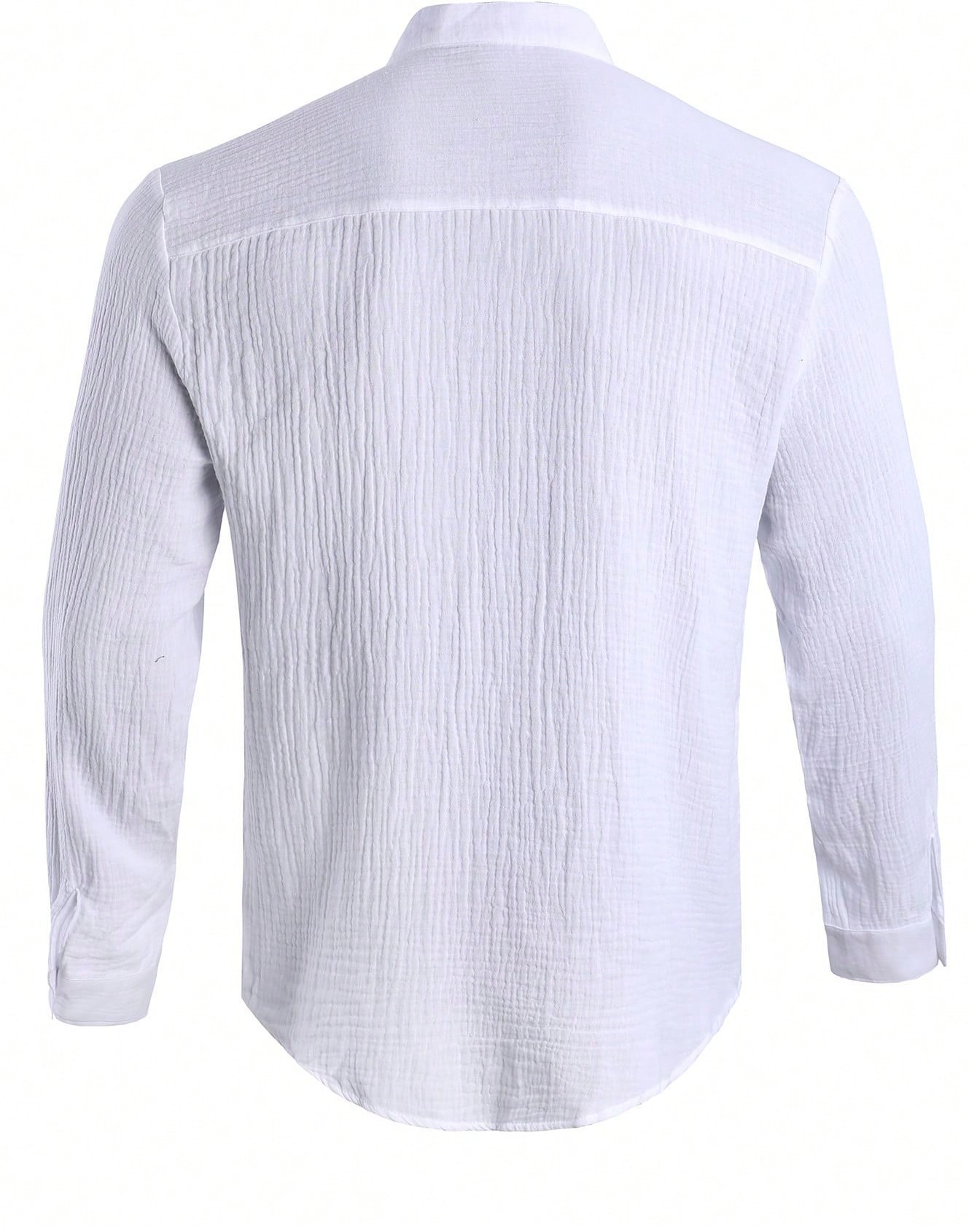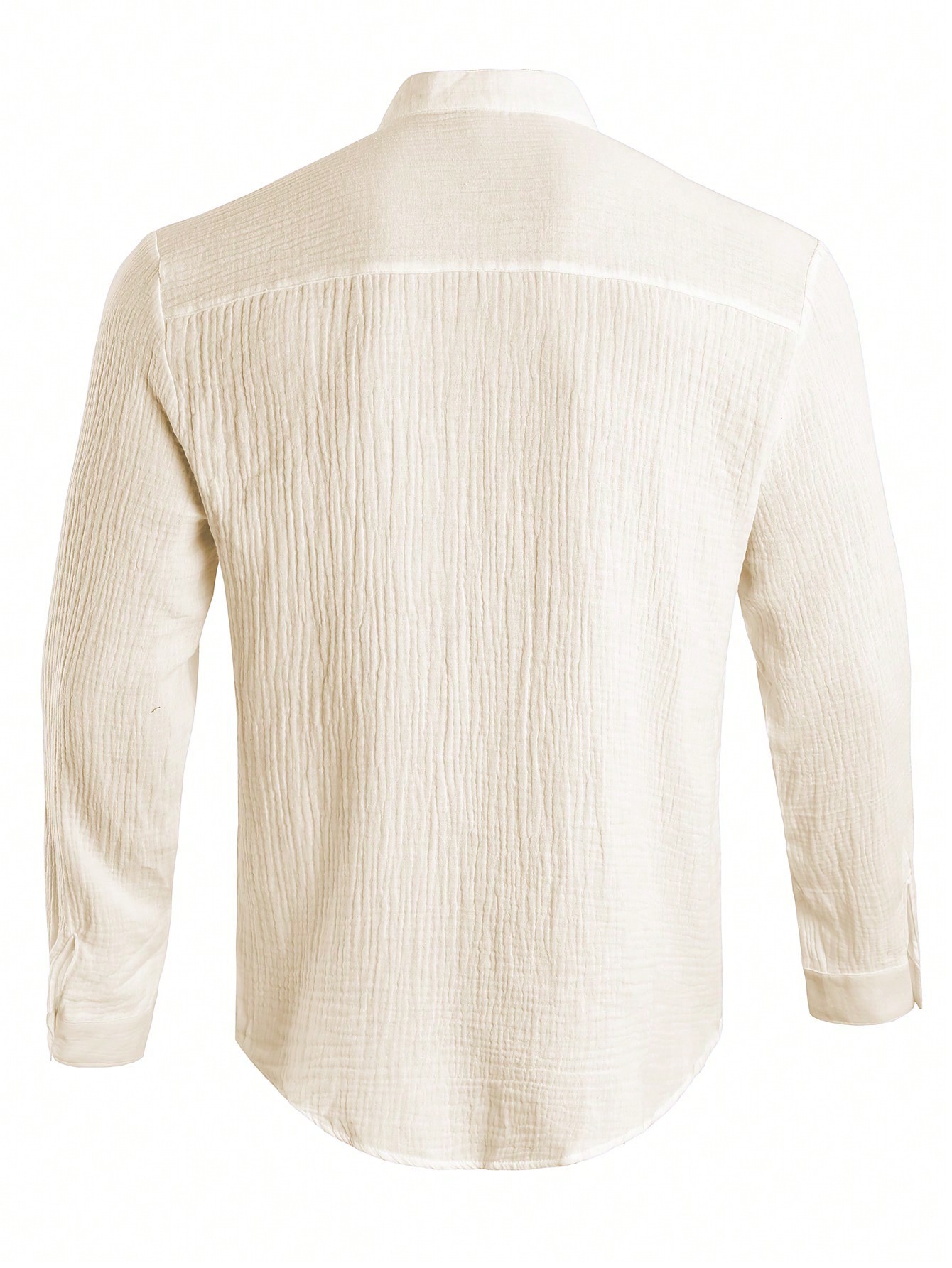クロスボーダーメンズリネン系バックルシャツ夏ビーチシャツ長袖無地スタンドカラー春夏カジュアル日常着