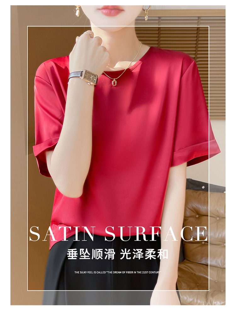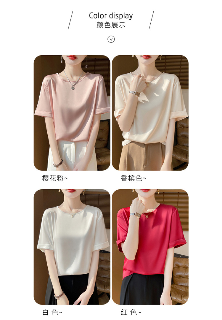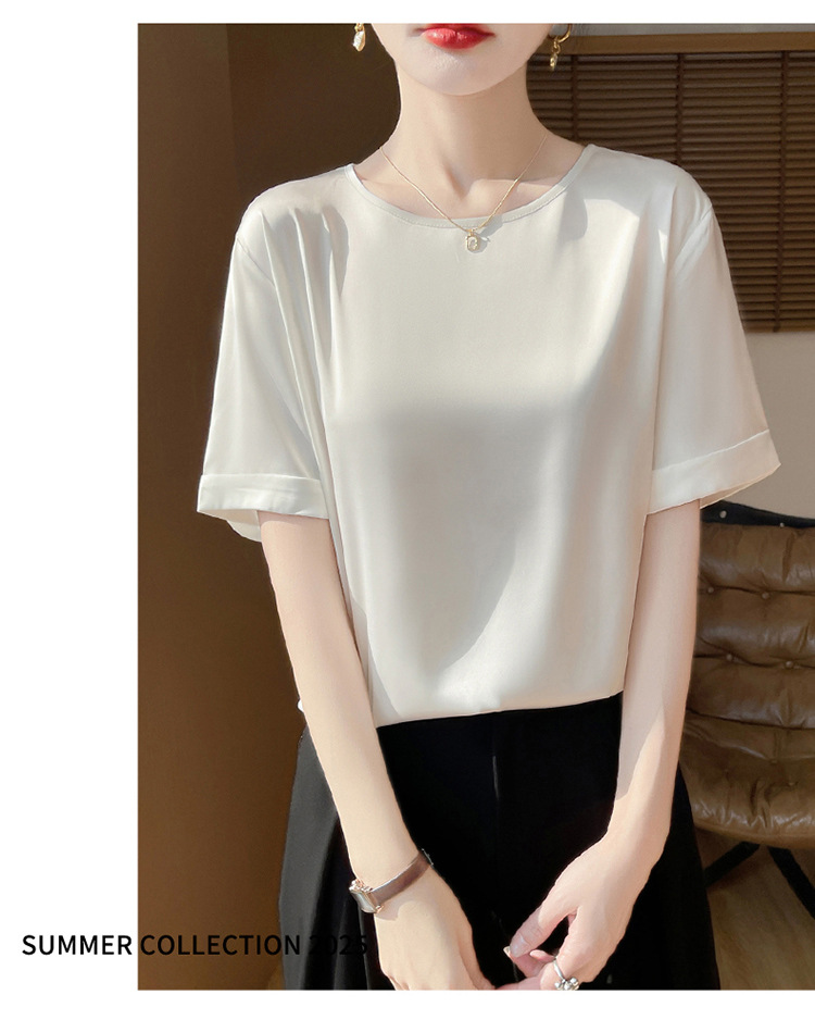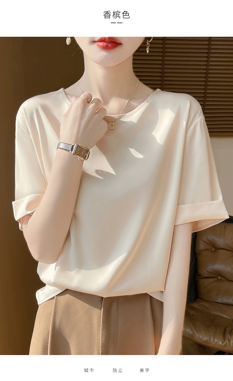 シルクのサテンの2025春夏の婦人服の新型の丸首の短いスタイルの気質は汗の大きいサイズの半袖を吸い込みます。
