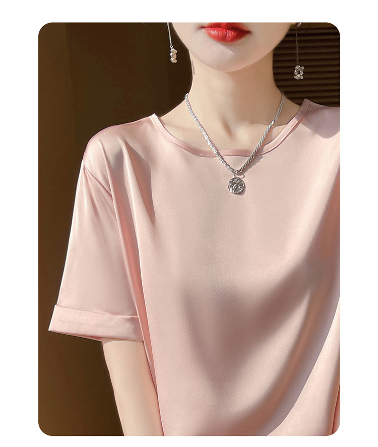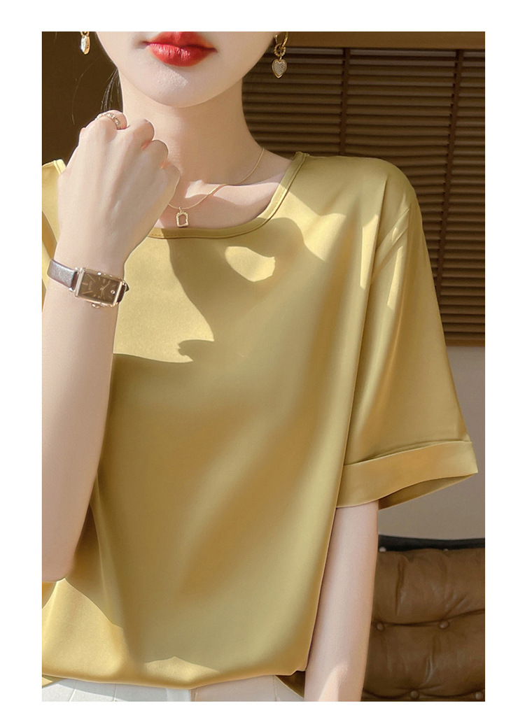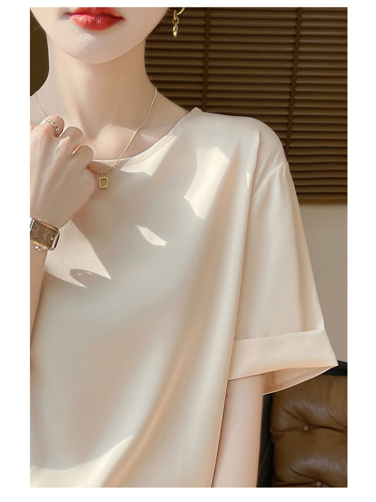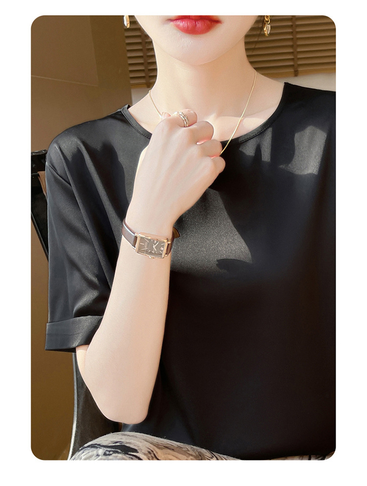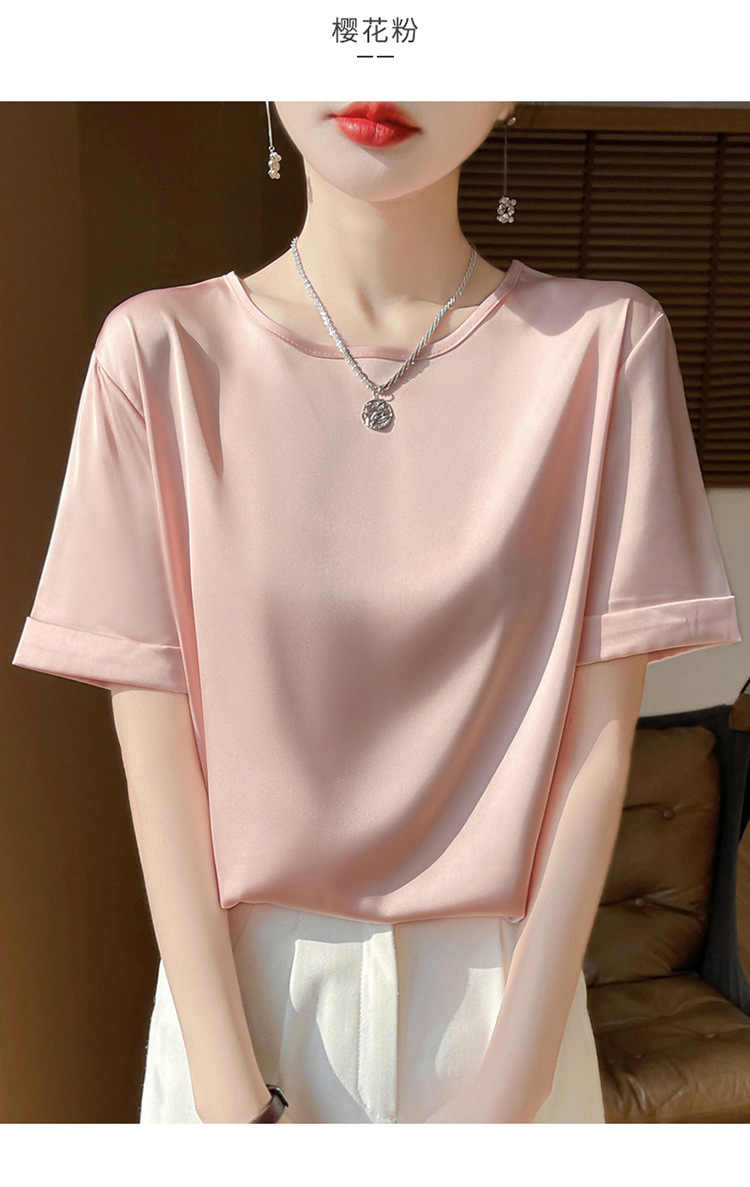 シルクのサテンの2025春夏の婦人服の新型の丸首の短いスタイルの気質は汗の大きいサイズの半袖を吸い込みます。