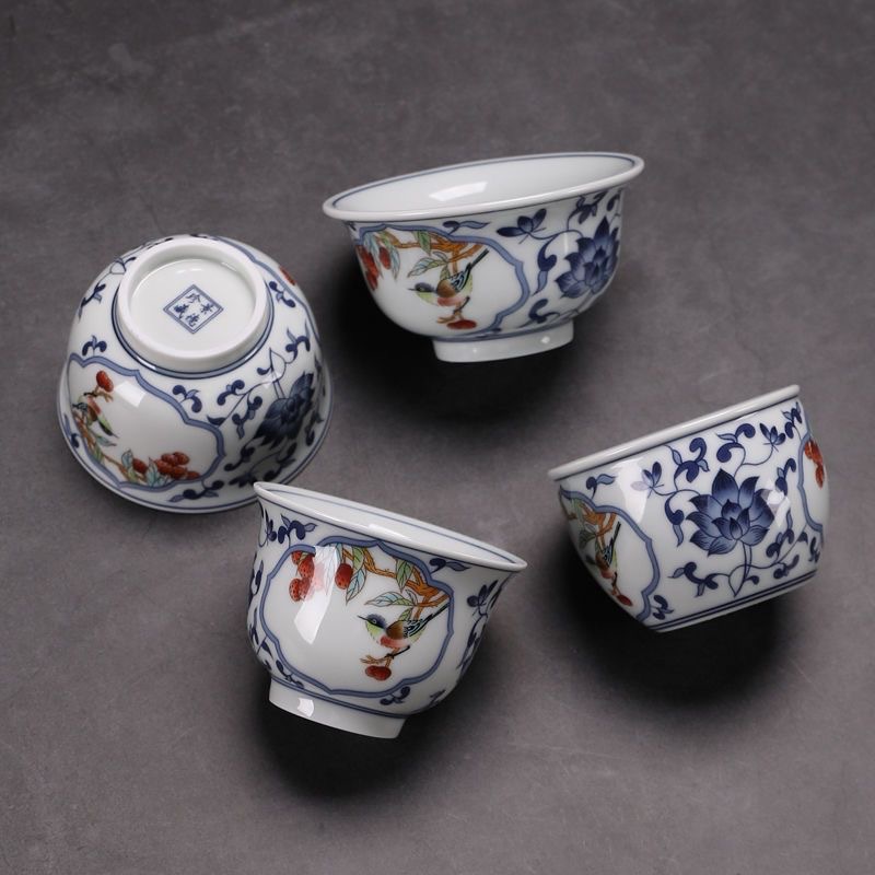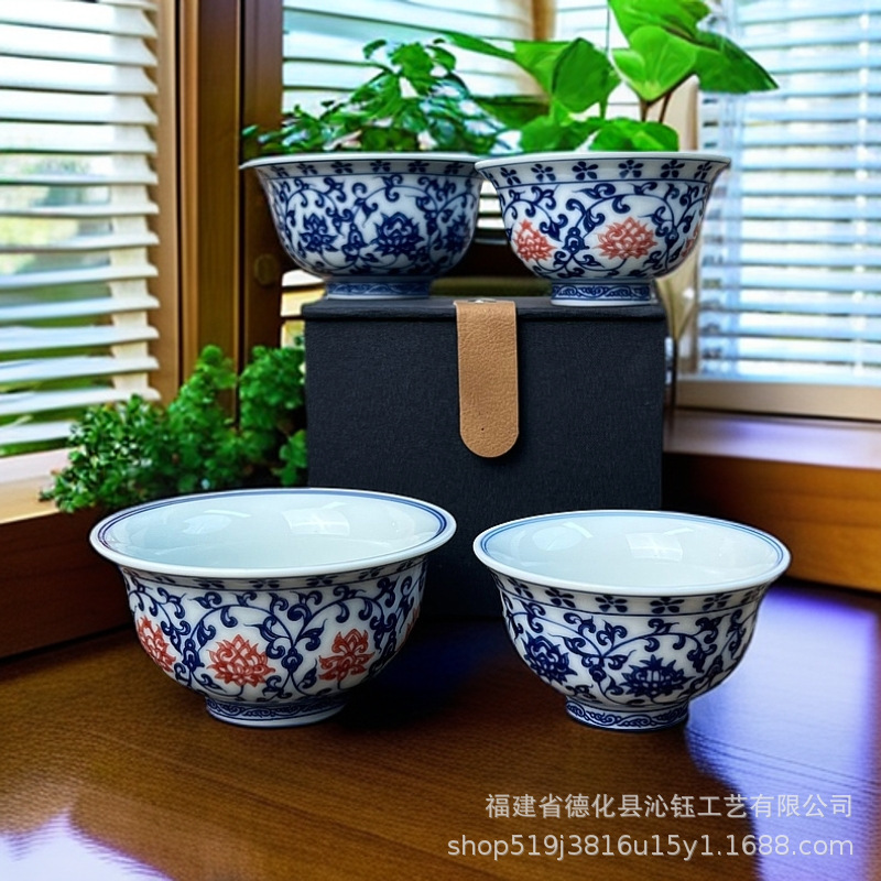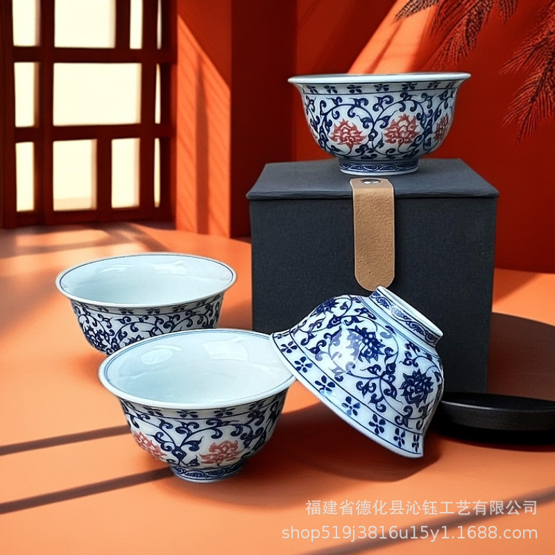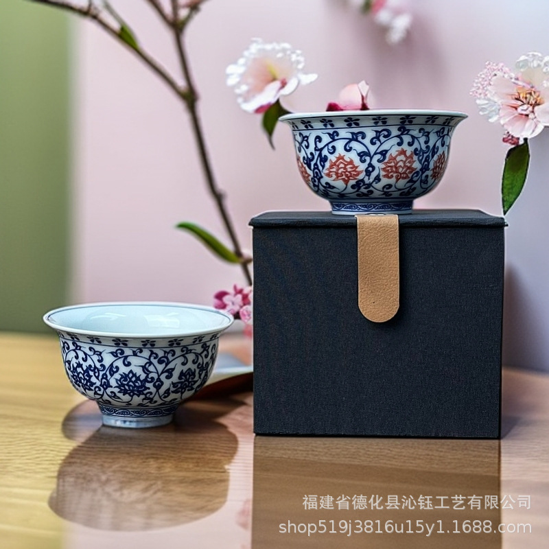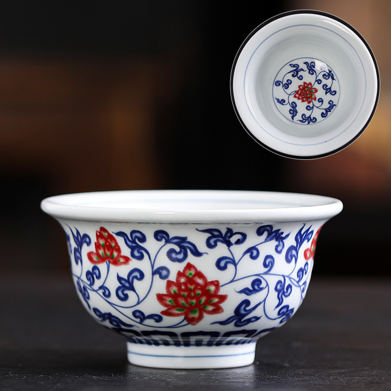 景徳鎮七丞堂は古泥の青と花の釉薬の中で赤い枝蓮の永楽の陶磁器の圧手の杯の主人の杯をまねてお茶の杯を飲みます。