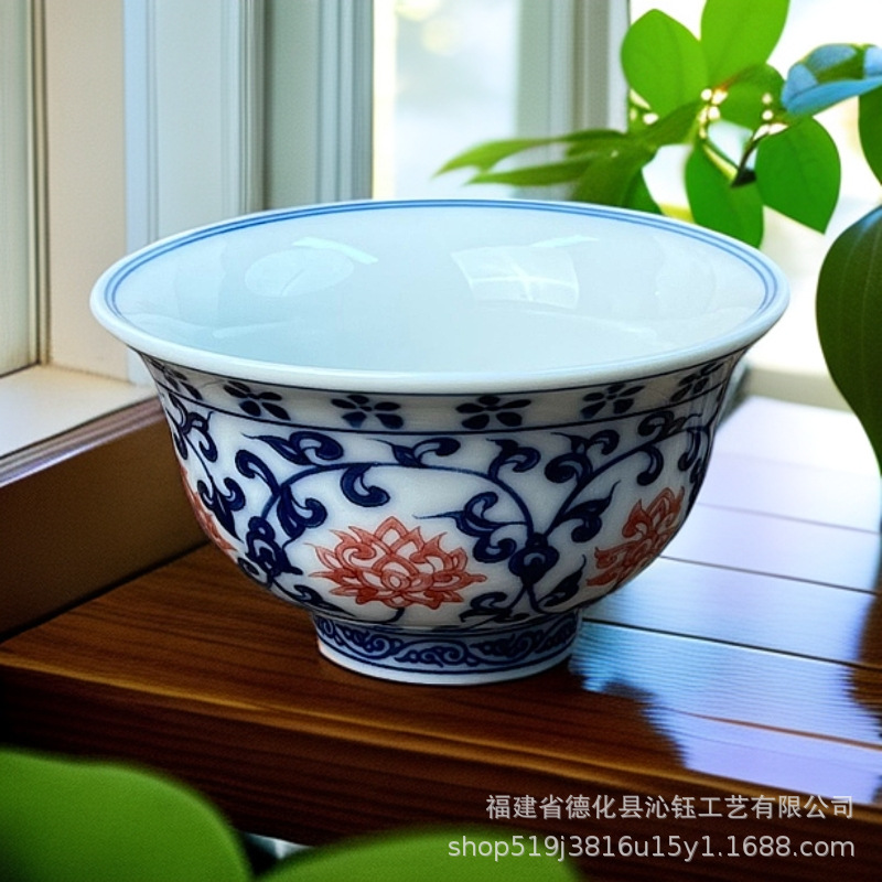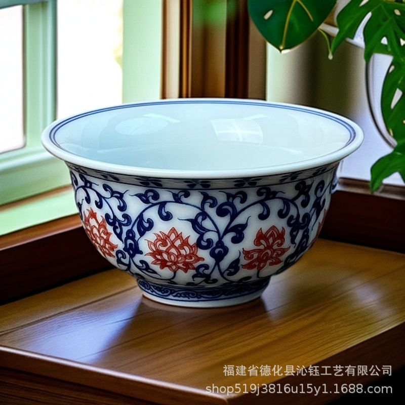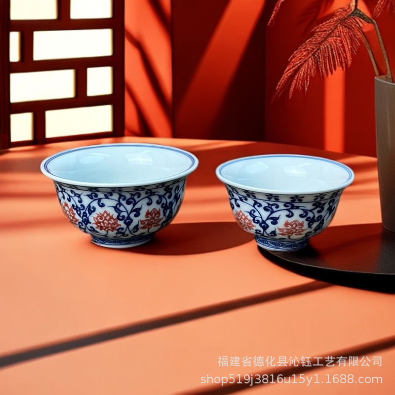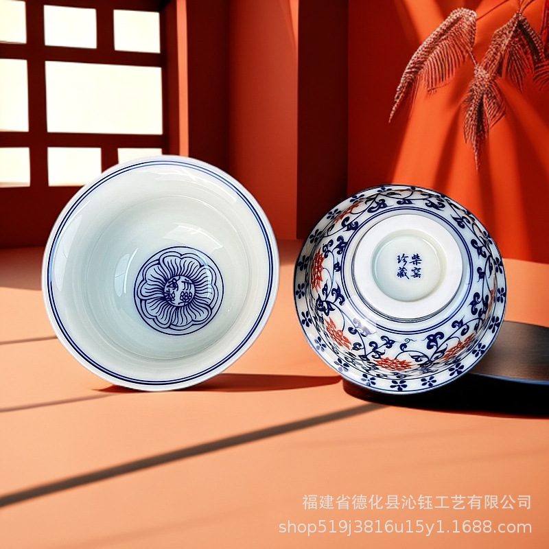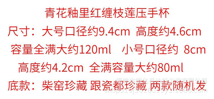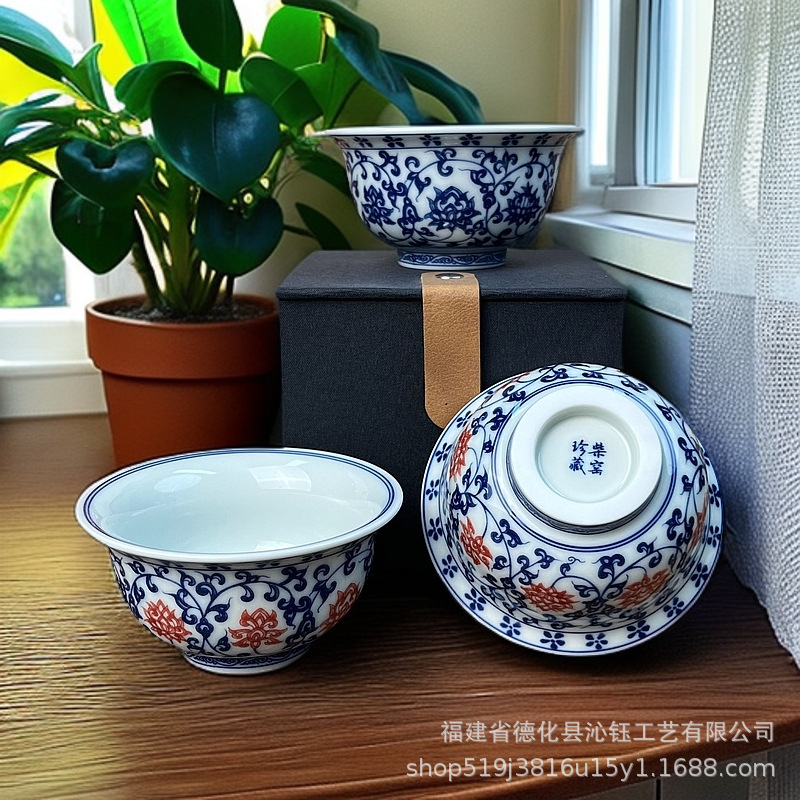 景徳鎮七丞堂は古泥の青と花の釉薬の中で赤い枝蓮の永楽の陶磁器の圧手の杯の主人の杯をまねてお茶の杯を飲みます。