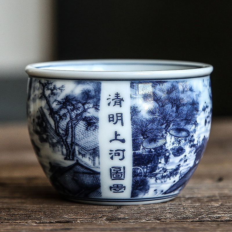 レトロなティーカップ青と花の釉薬の中の赤い主人の杯の陶磁器の工夫の茶道具のお茶の杯の清明の上河図の圧手の杯