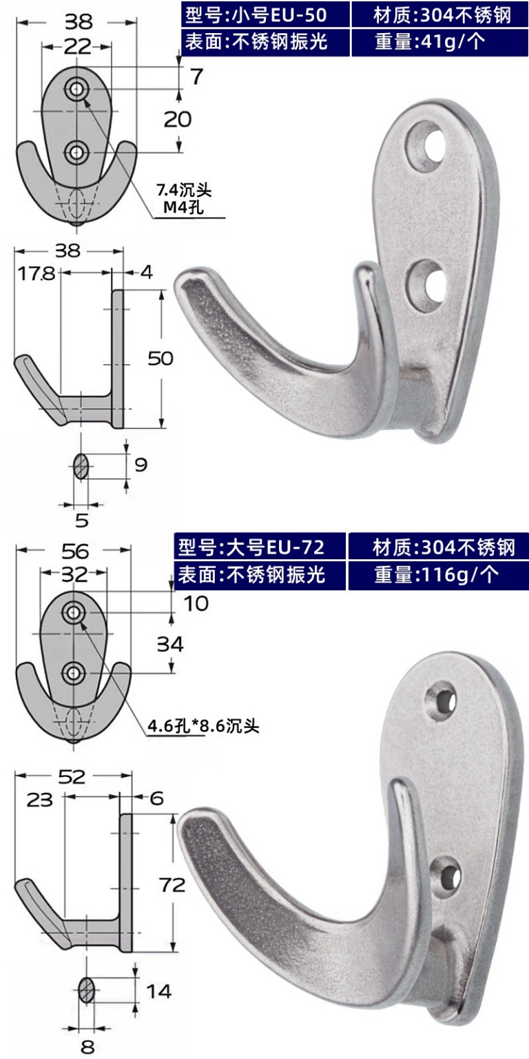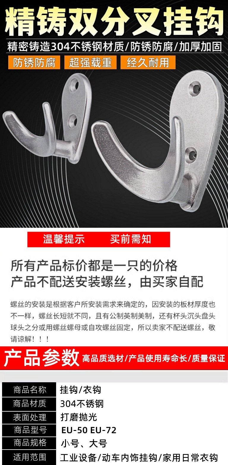 304ステンレスフックEU-50スプリットシングルフック重荷重型ハンガーフックキッチン壁挂けバスルーム吊りハンガーフック