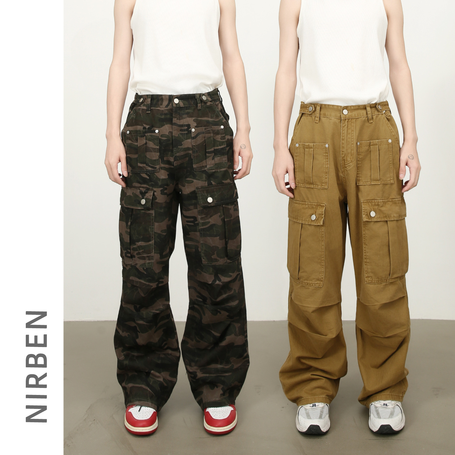 Nirbenデニム | アメリカのレトロなマルチポケット迷彩工装ズボン男性デザイン感しわゆるいストレートパンツ