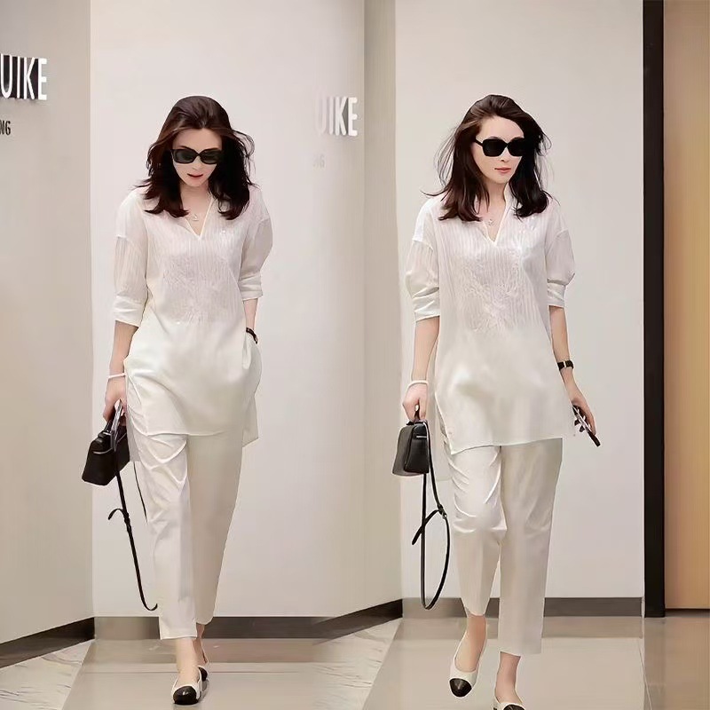 2025年夏のネット紅の新型ファッションの精巧な気質vネックの重工業のスパンコールの中袖の上着のズボンのスーツの女性
