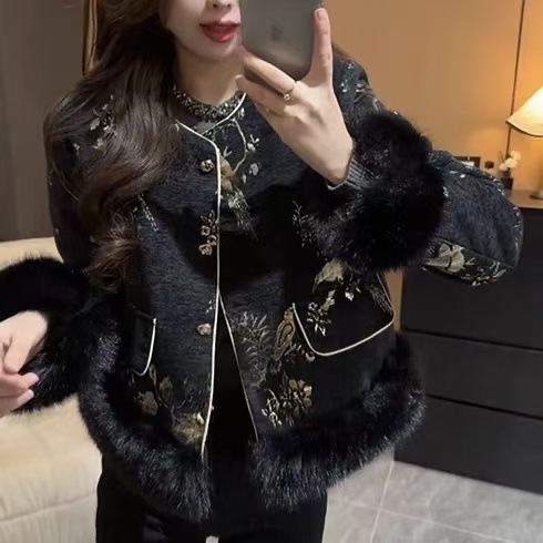 2025新型レトロなスタンドカラーの刺繍プリントの毛羽と綿の新中国風コートの女性冬