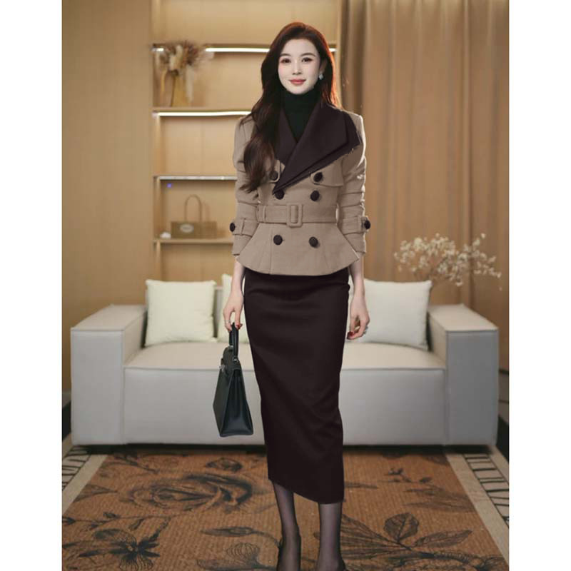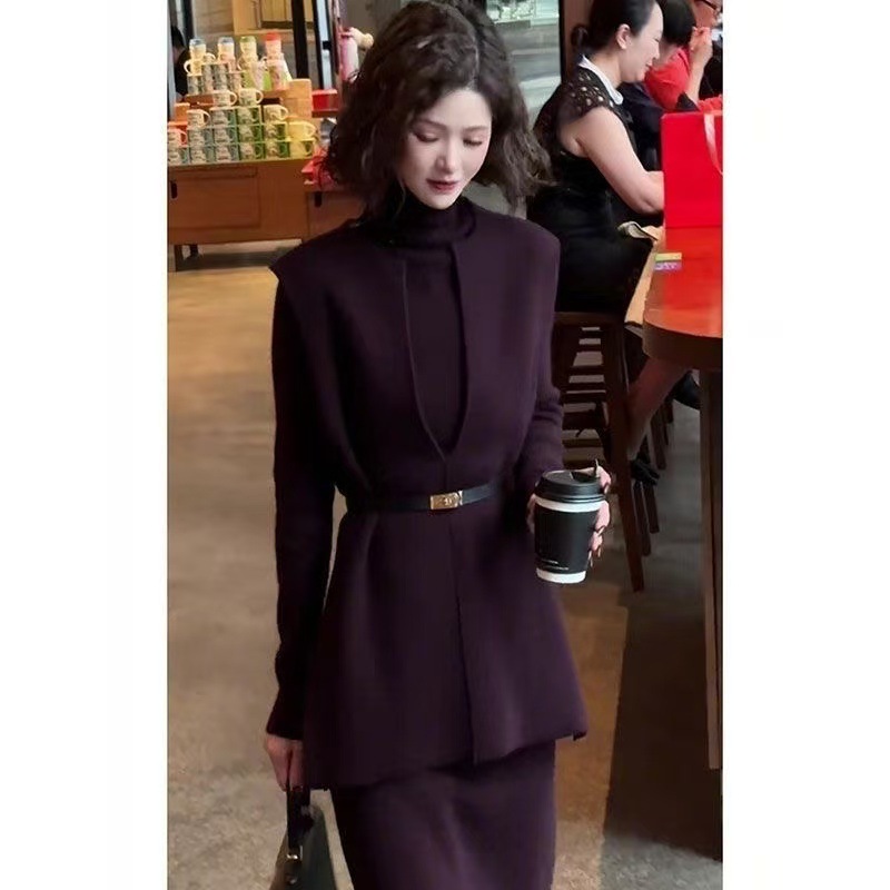 韓国版の気質の高級感の純色はやせている女装の秋冬の新型の流行の腰を収めて底の馬甲の半スカートのスーツを打ちます。